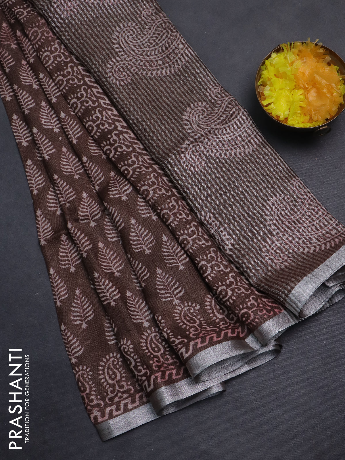 Pure linen saree brown with allover butta prints and silver zari woven border