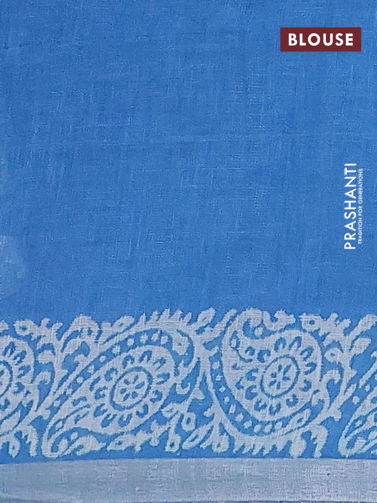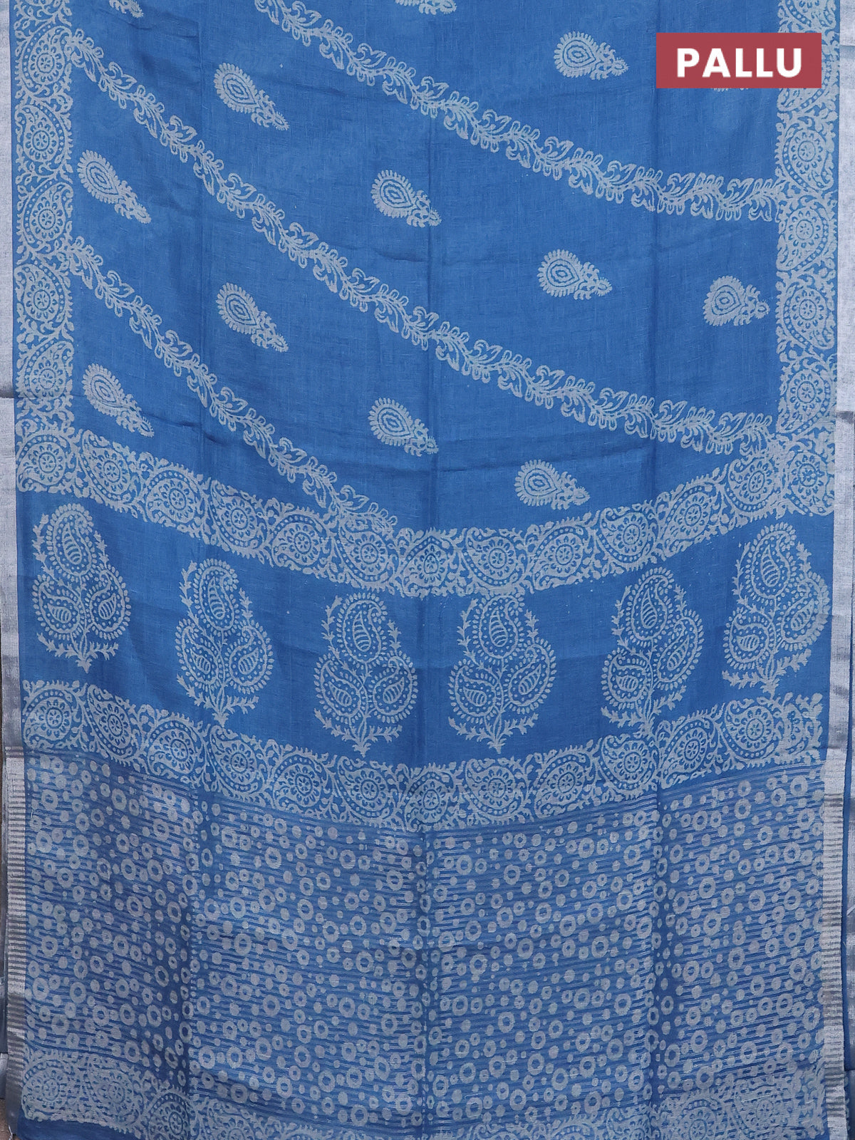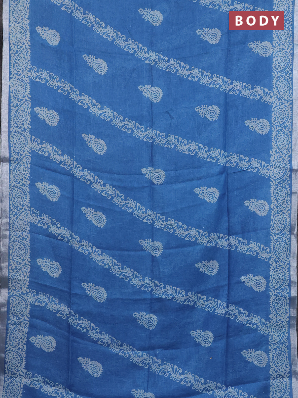 Pure linen saree cs blue with allover butta prints and silver zari woven border