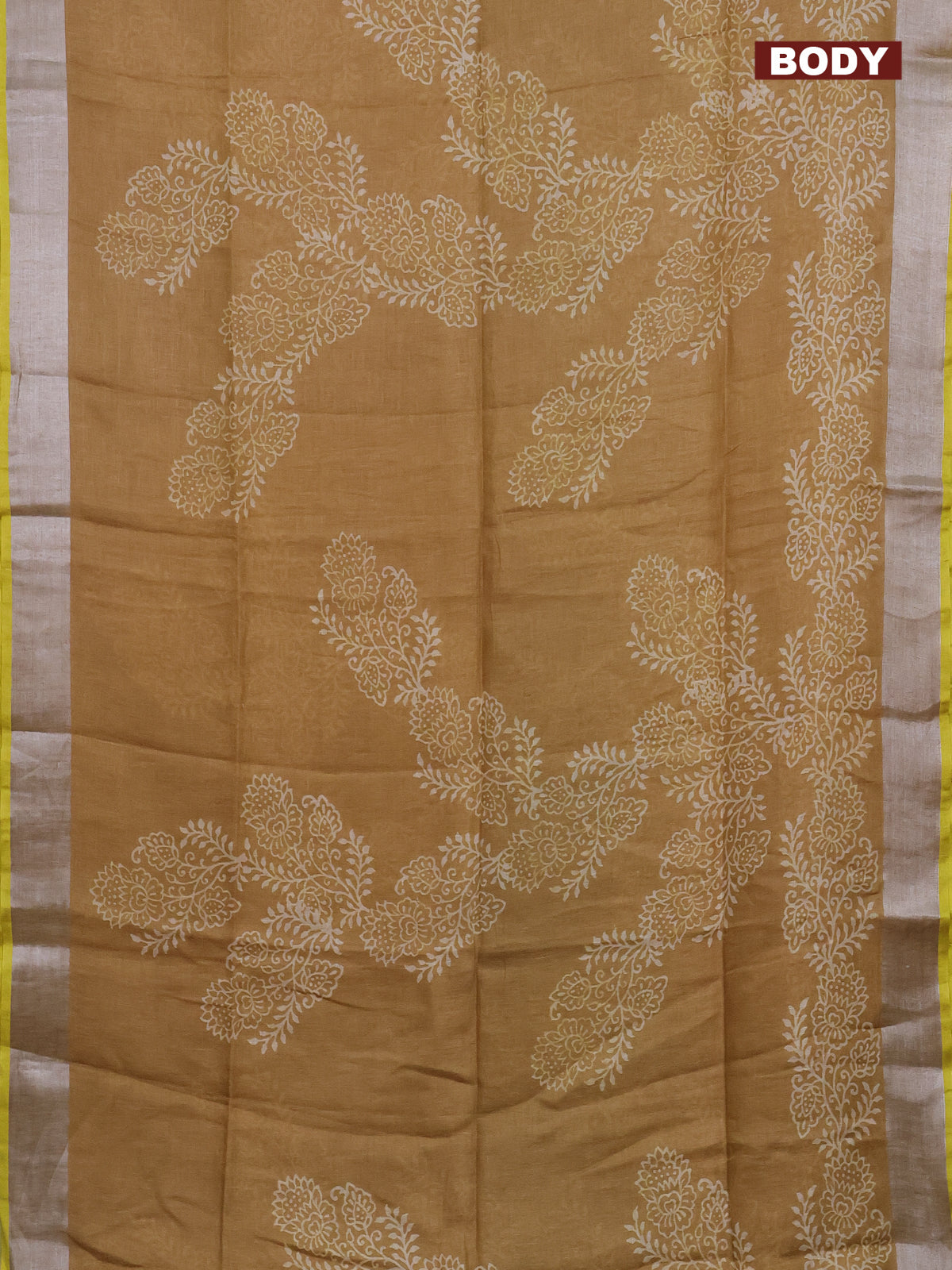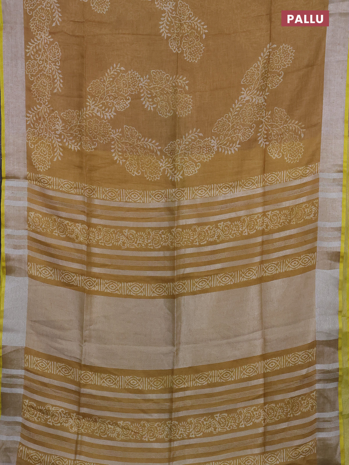 Pure linen saree dark sandal with allover prints and silver zari woven border