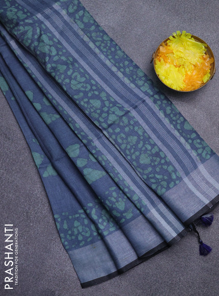 Pure linen saree greyish blue and pastel green with batik butta prints and zari woven border