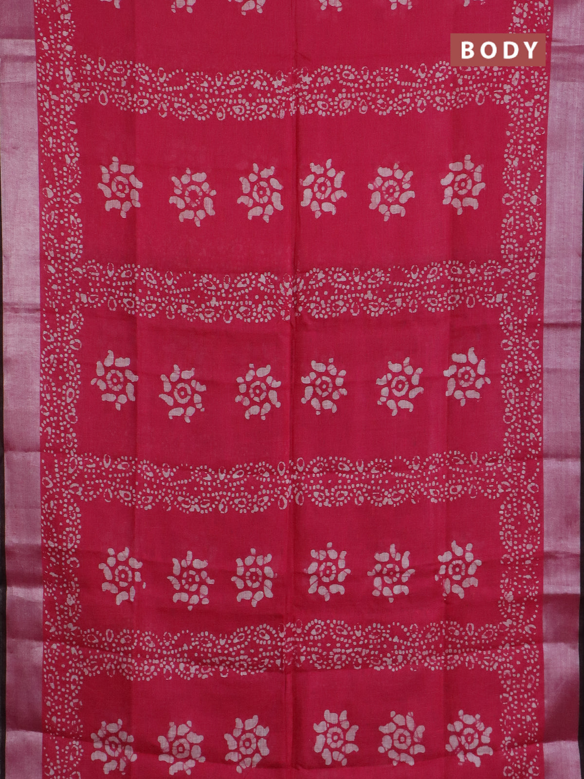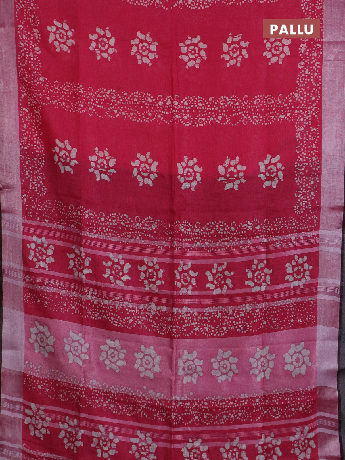 Pure linen saree pink and black with allover batik prints and silver zari woven border