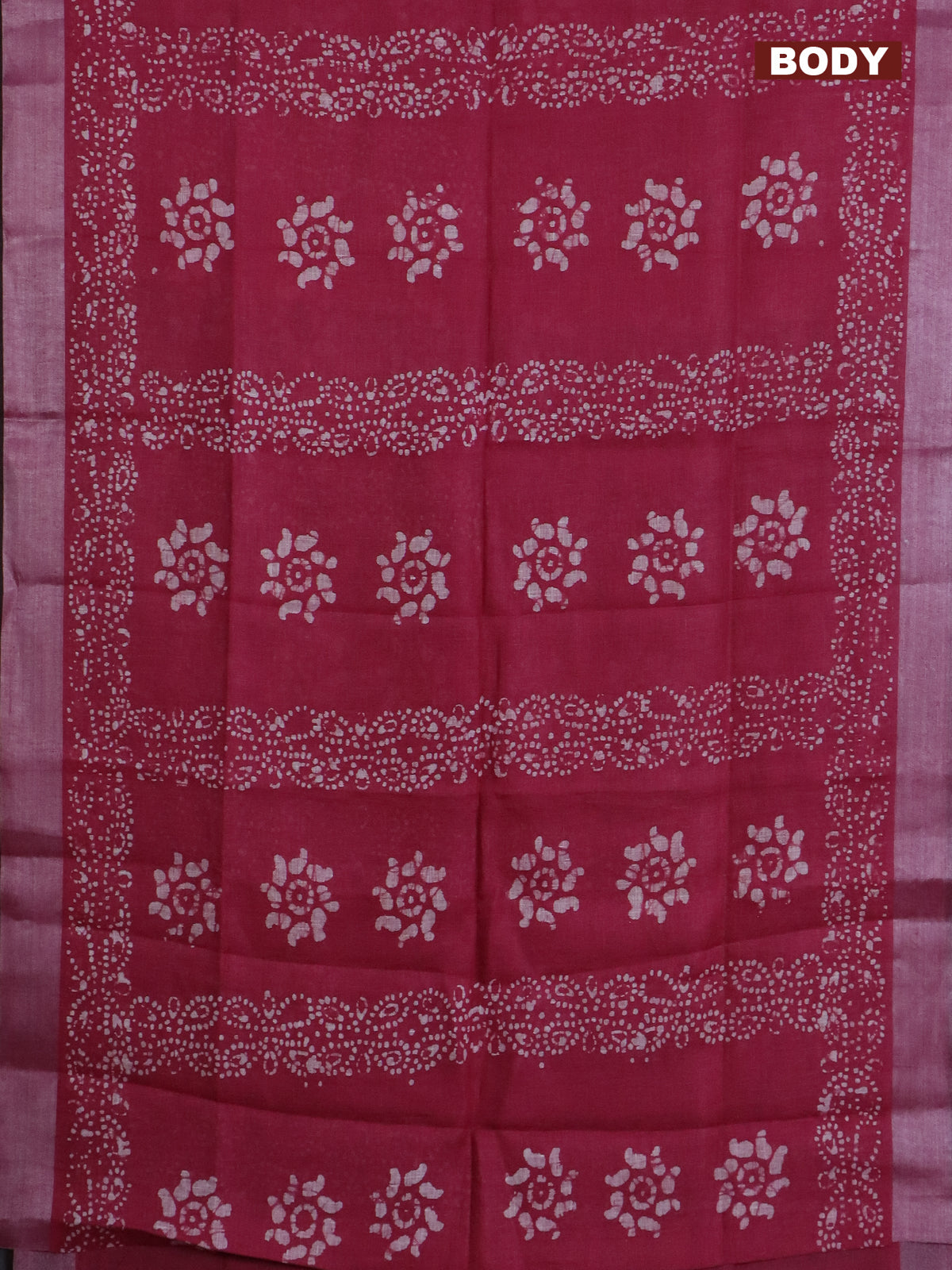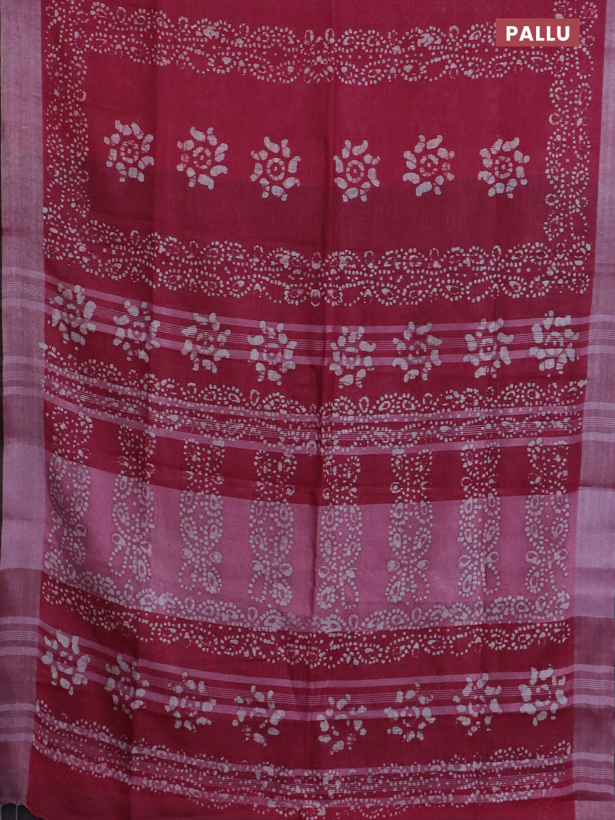 Pure linen saree pink and black with allover batik prints and silver zari woven border