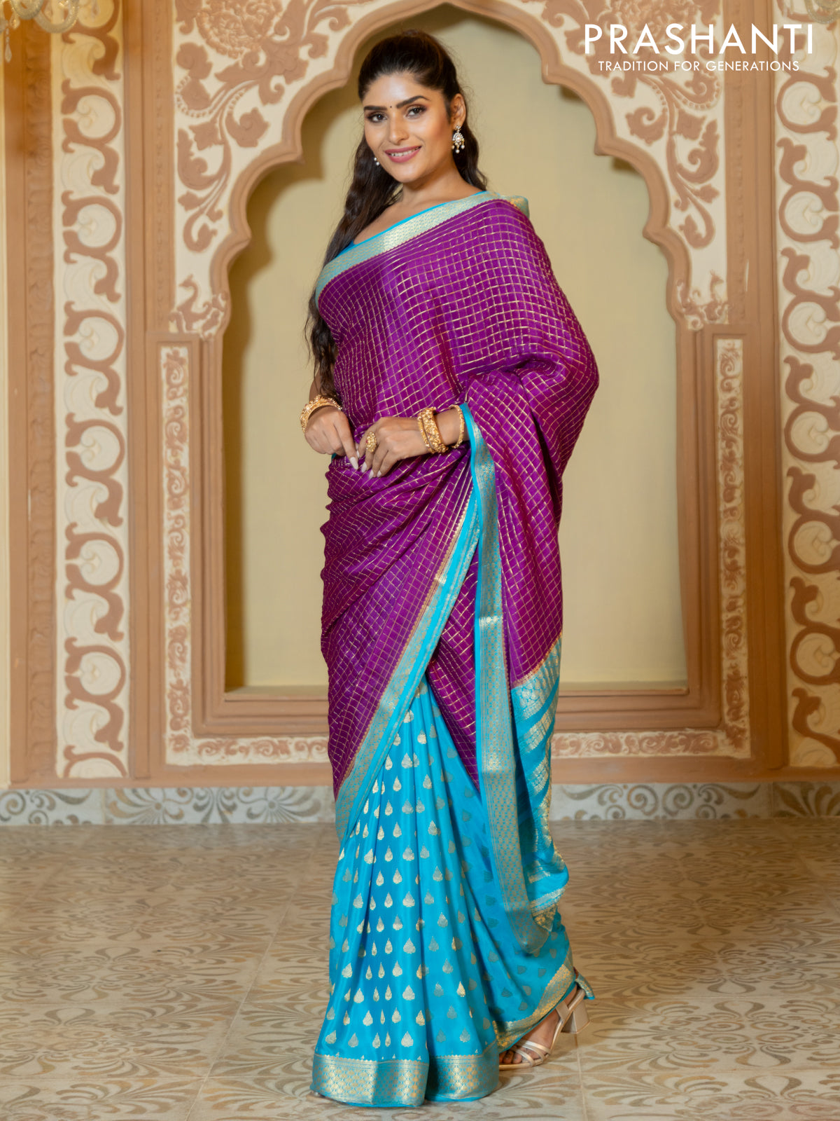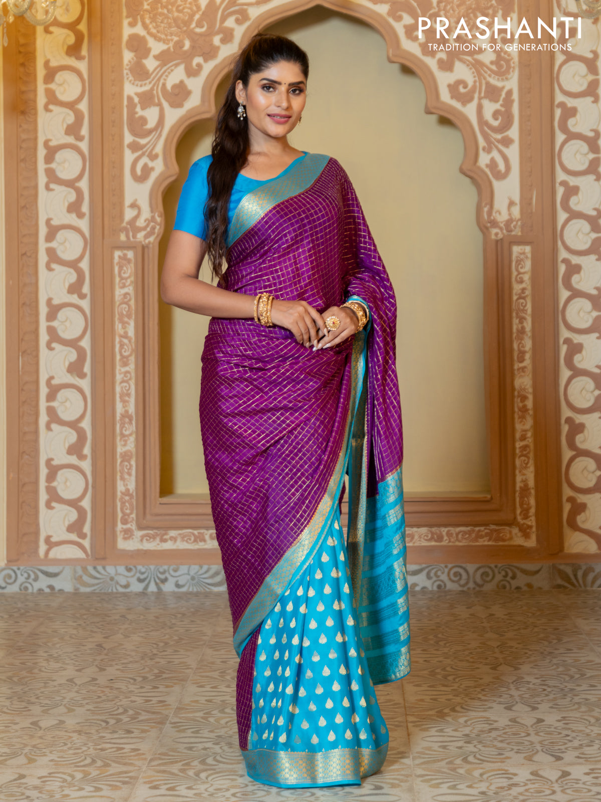 Pure mysore partly silk saree purple and cs blue with allover zari checked pattern and zari woven border