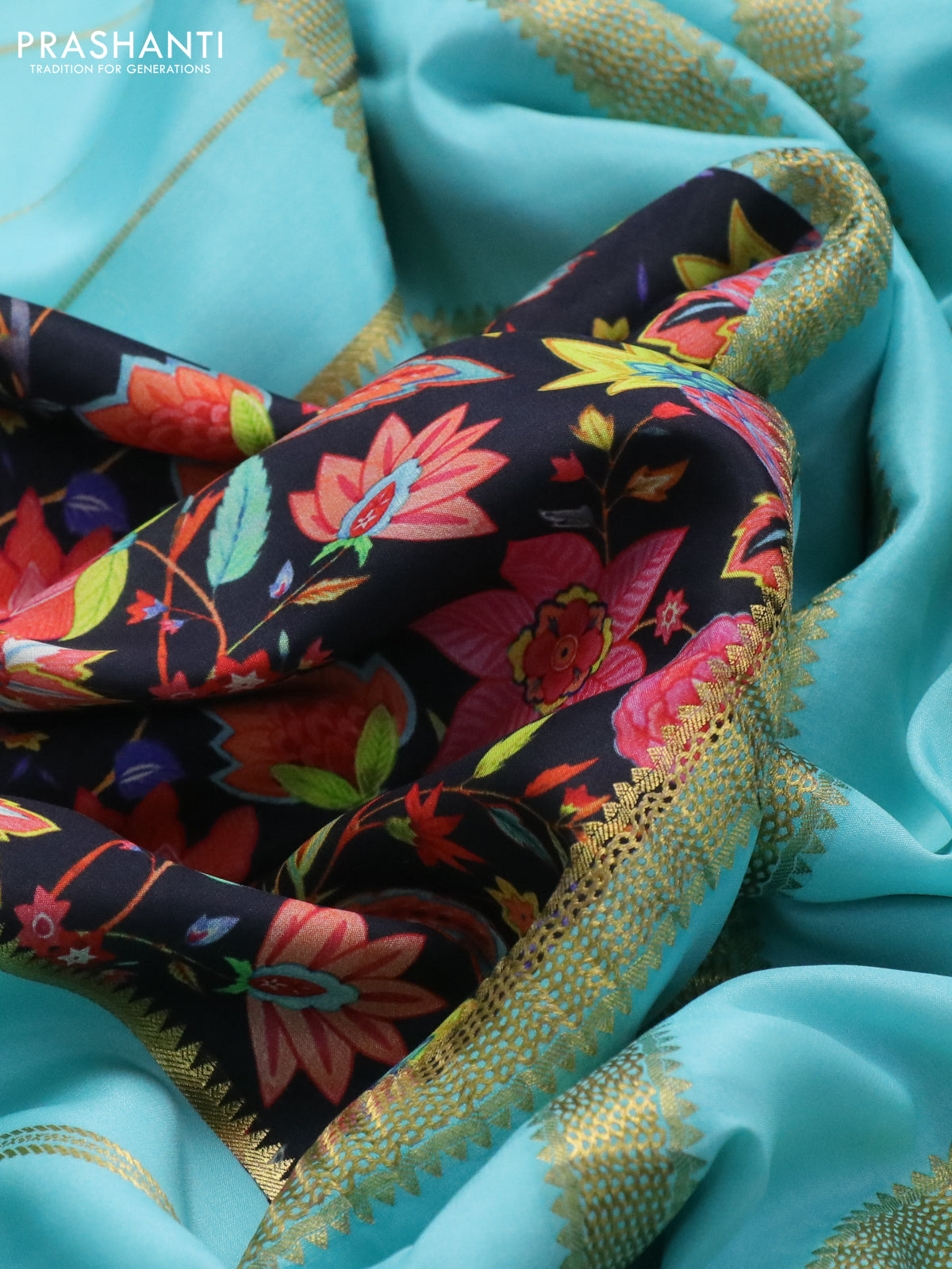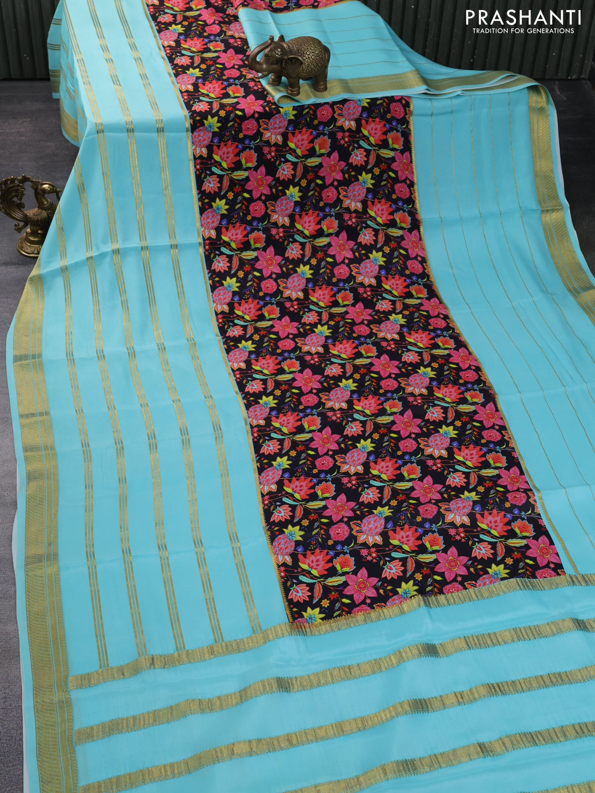 Pure mysore silk saree black and teal shade with kalamkari digital prints and long zari woven border