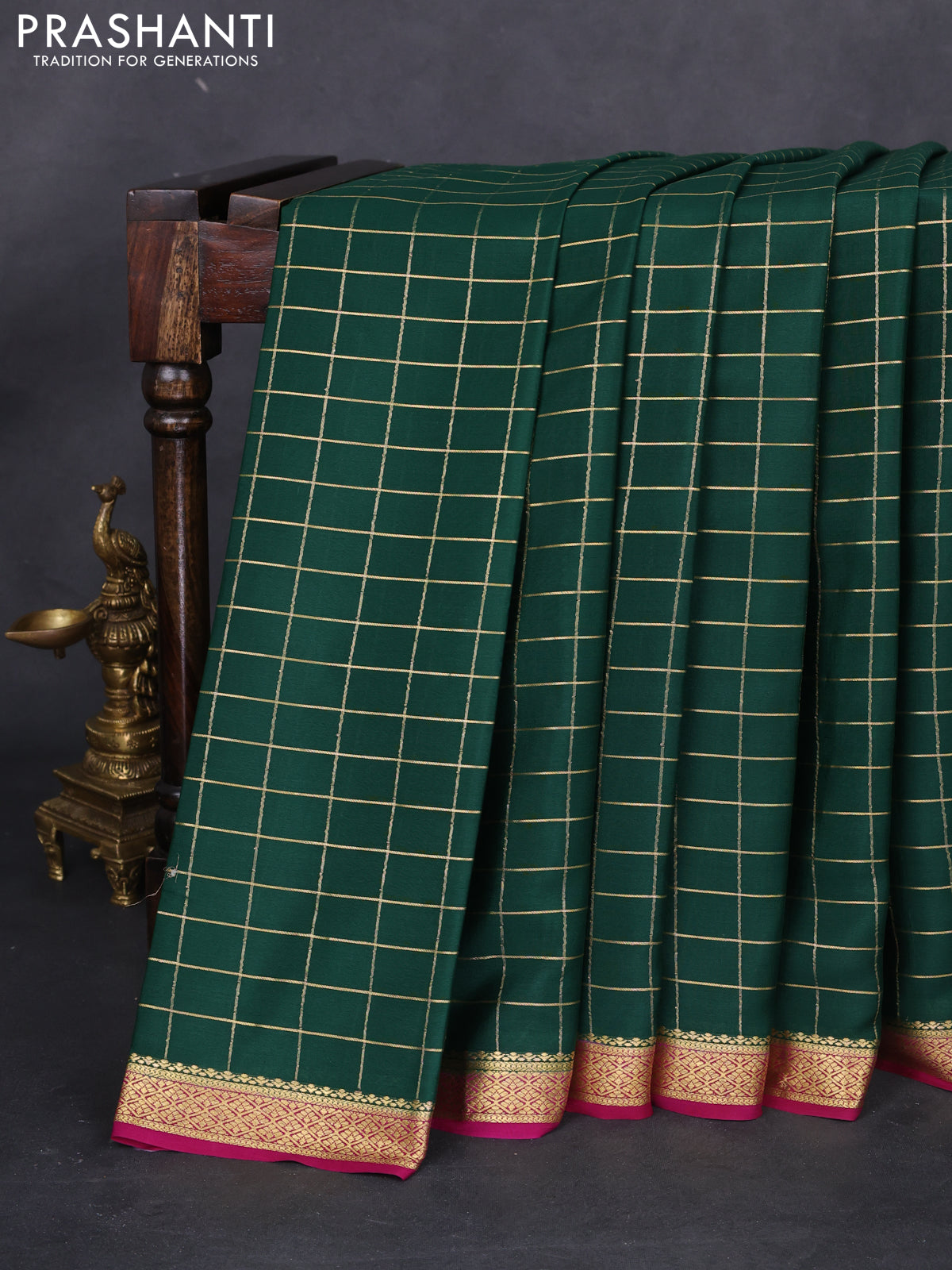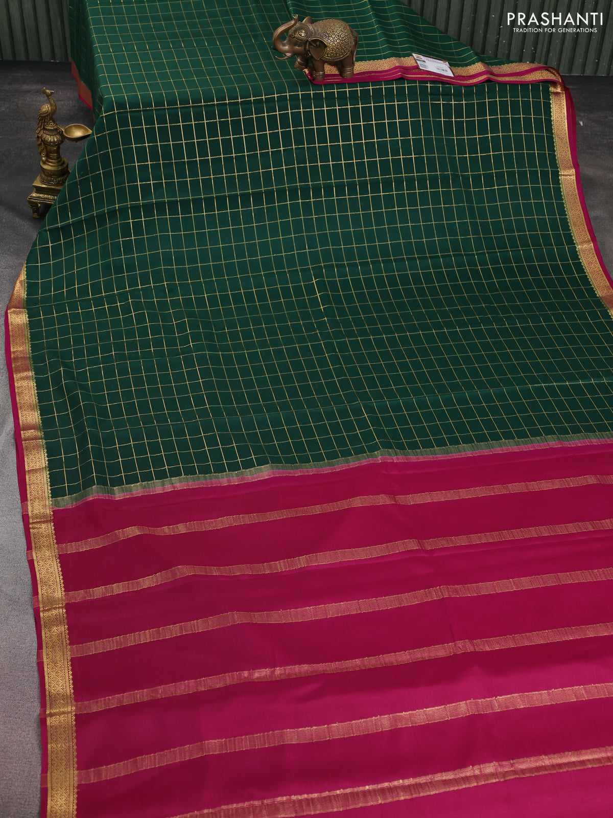 Pure mysore silk saree bottle green and magenta pink with allover zari checked pattern and zari woven border