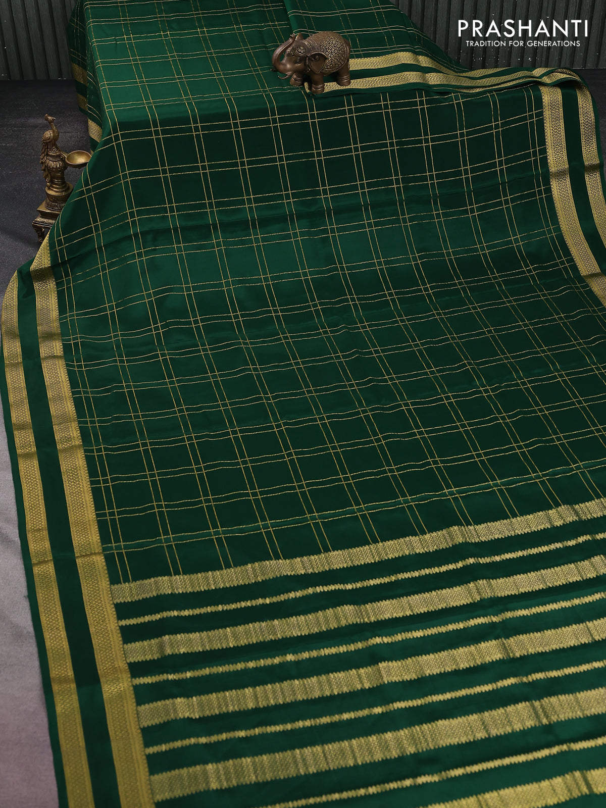 Pure mysore silk saree bottle green with allover zari woven checked pattern and rettapet zari woven border