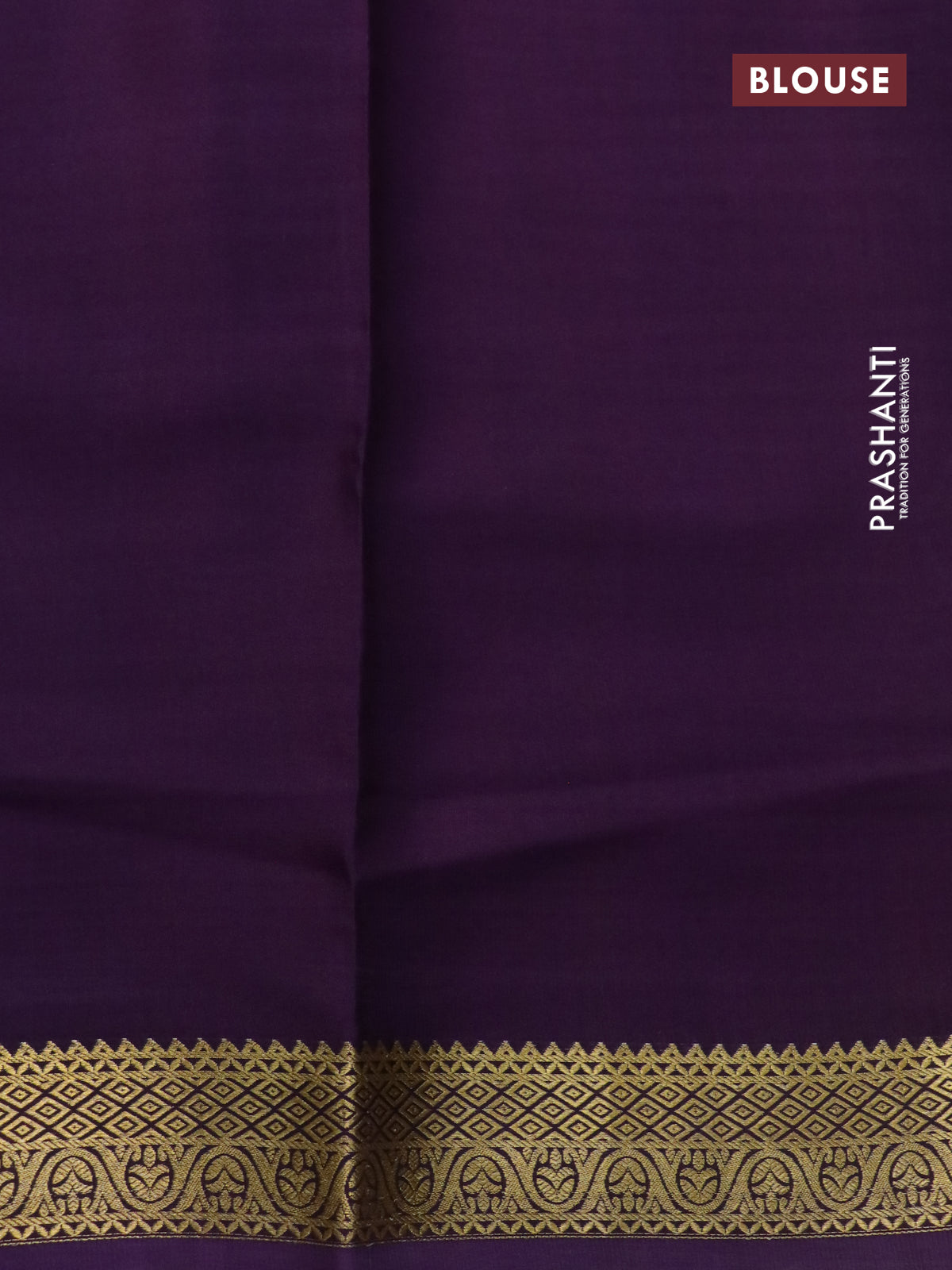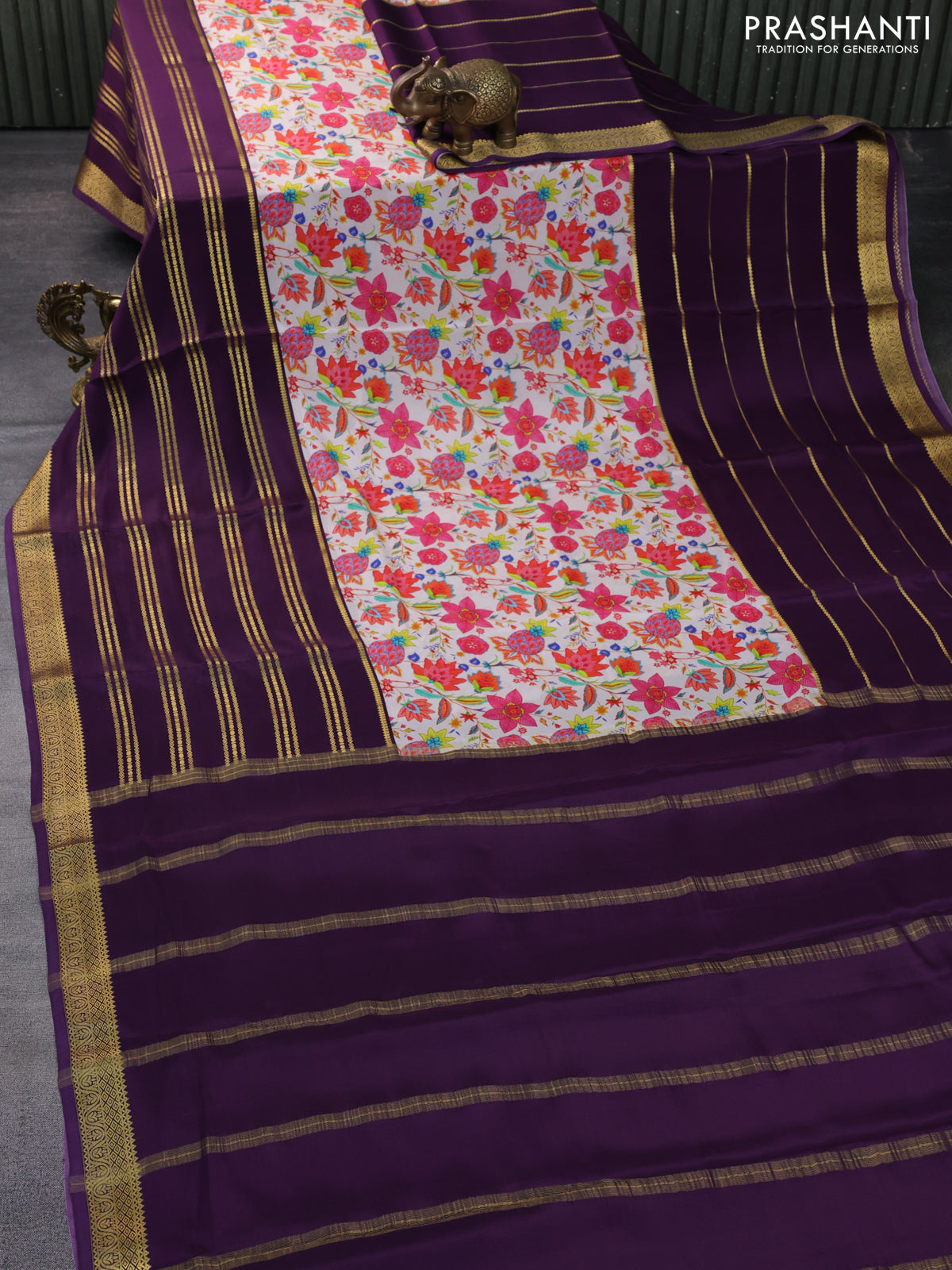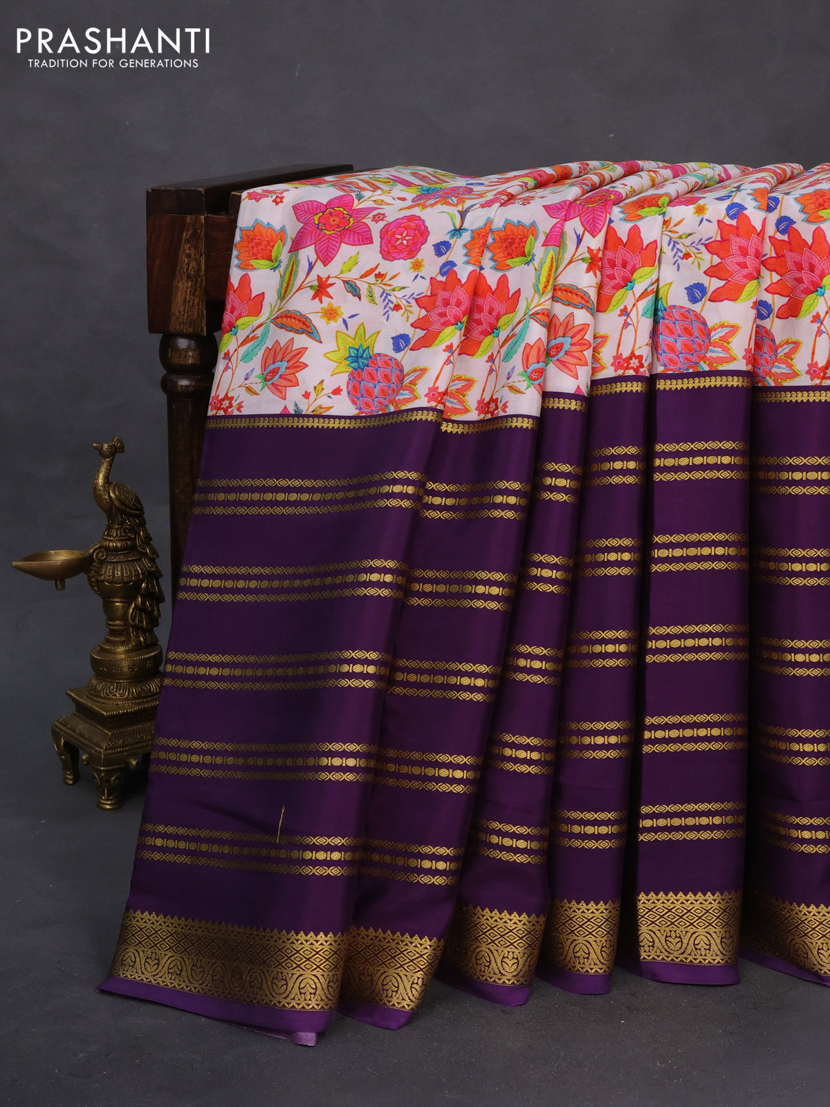 Pure mysore silk saree cream and deep purple with kalamakri digital prints and long zari woven border