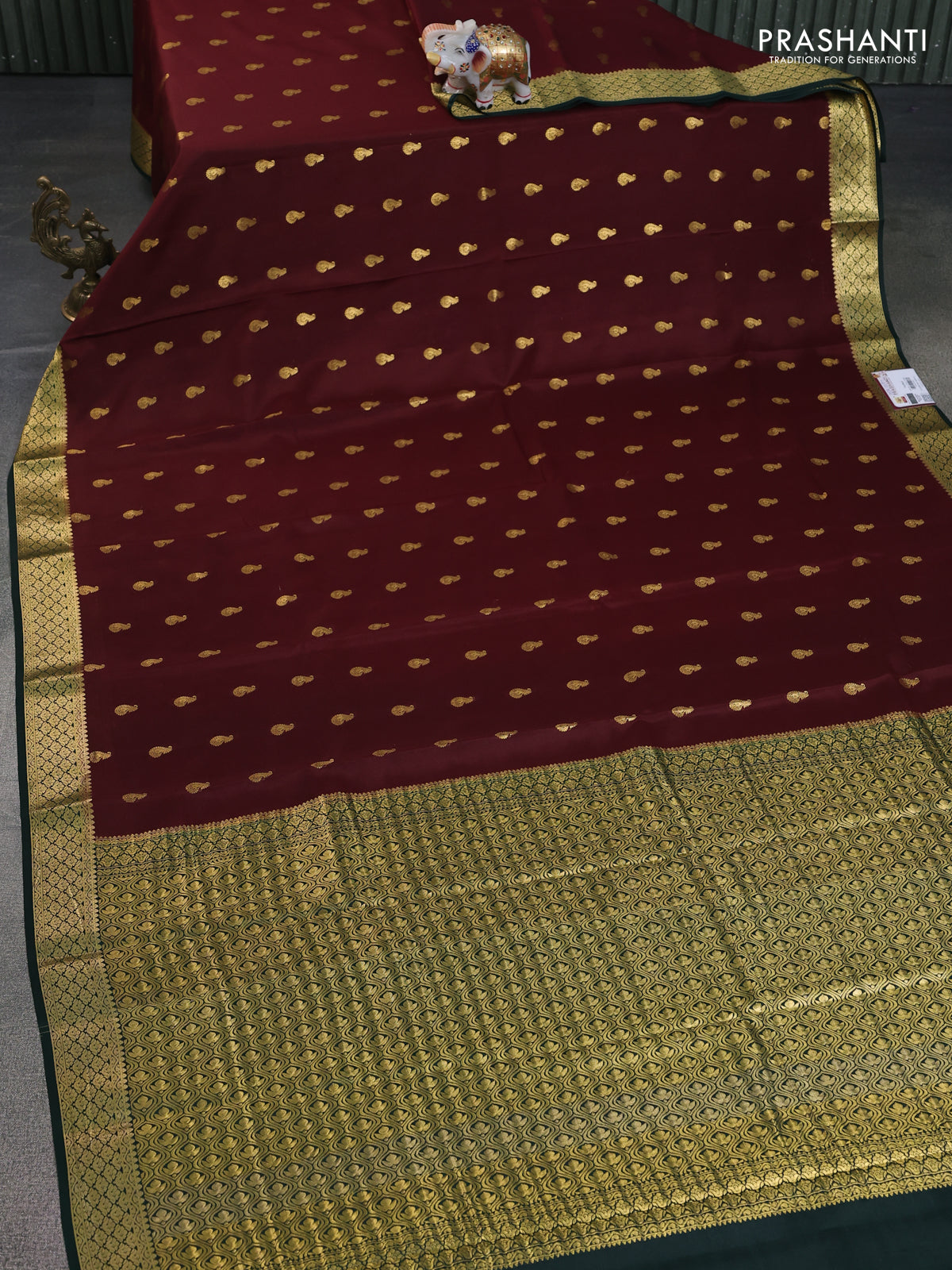 Pure mysore silk saree deep maroon and green with zari woven buttas and zari woven border