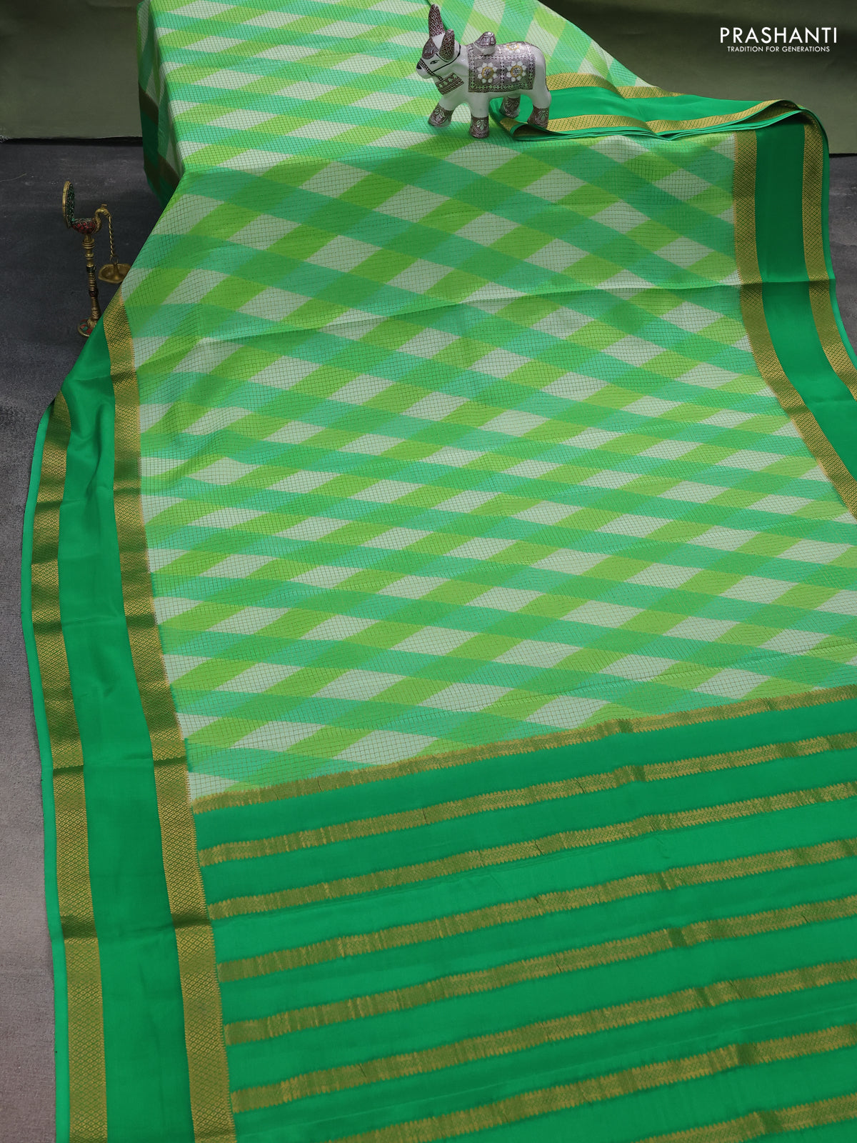 Pure mysore silk saree green with allover checks & geometric prints and rettapet zari woven border