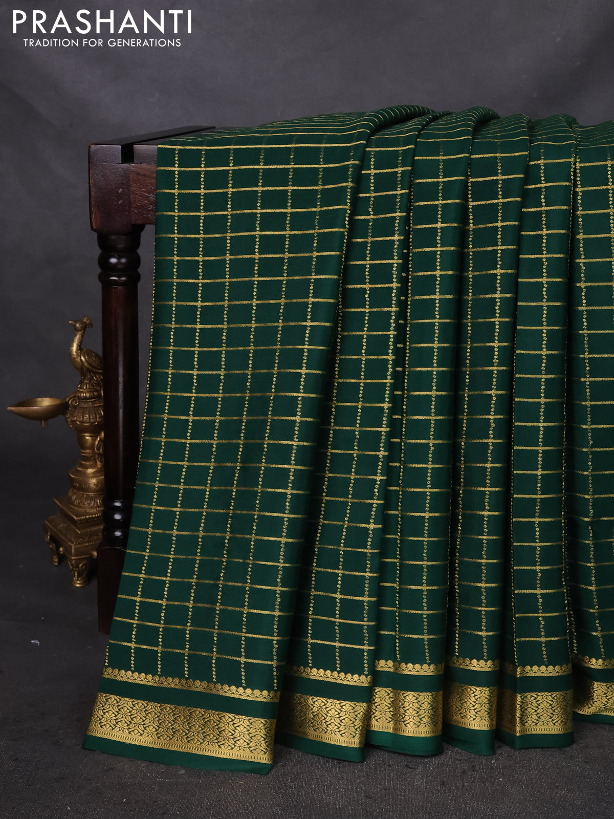 Pure mysore silk saree green with allover zari checked pattern and zari woven border