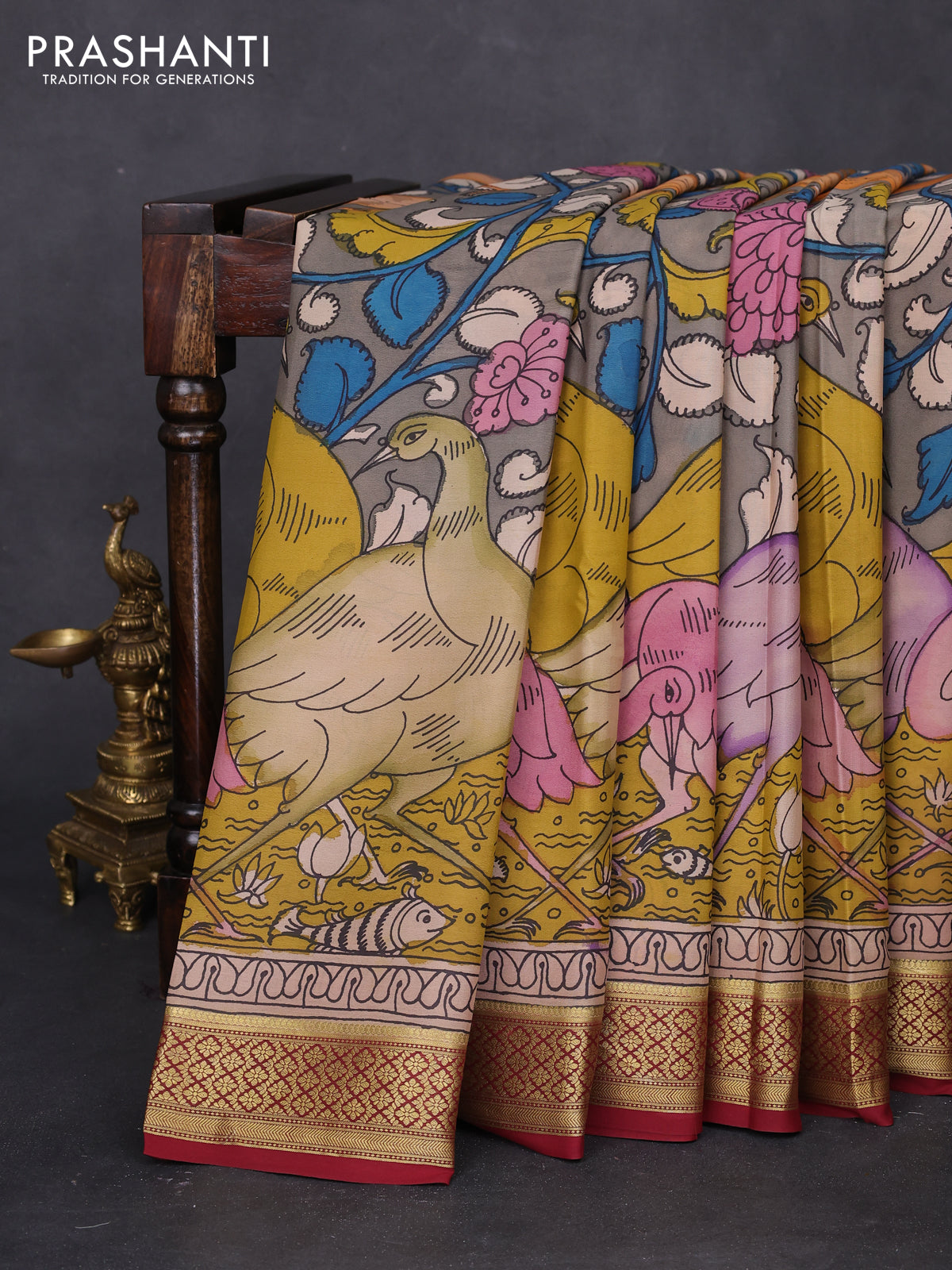 Pure mysore silk saree grey and maroon with allover pen kalamkari prints and zari woven border