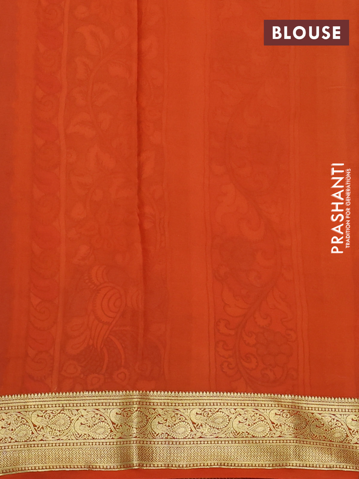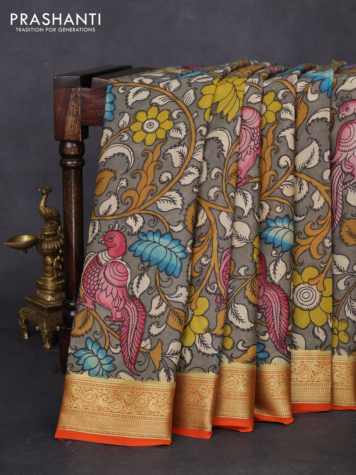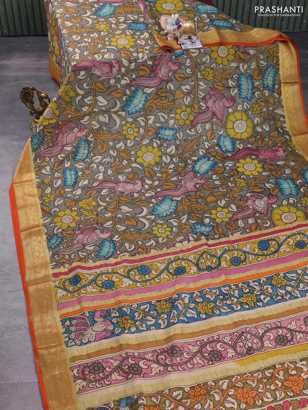 Pure mysore silk saree grey and orange with allover pen kalamkari prints and zari woven border