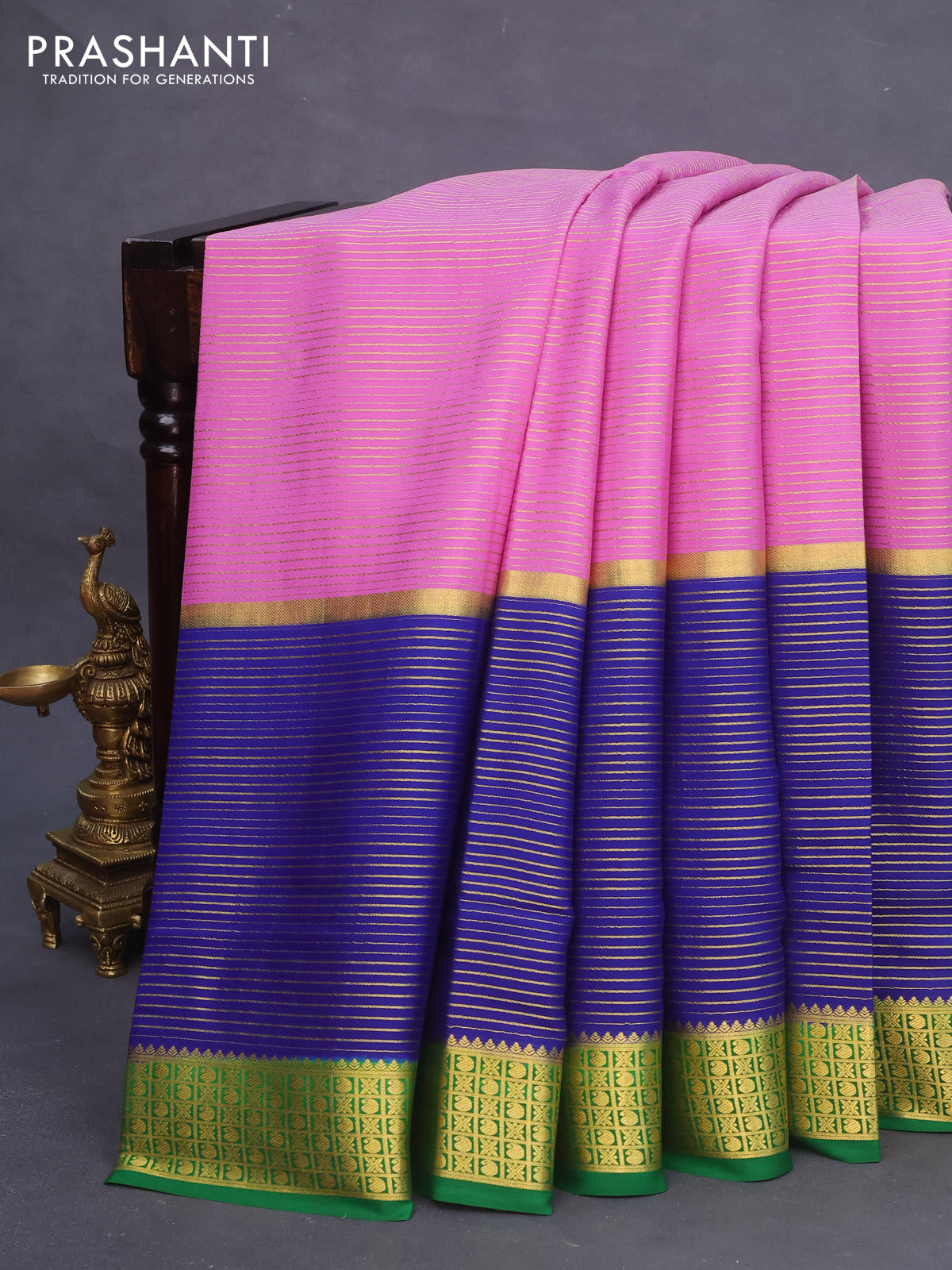 Pure mysore silk saree lavender and blue green with allover zari stripe weaves and long zari woven border