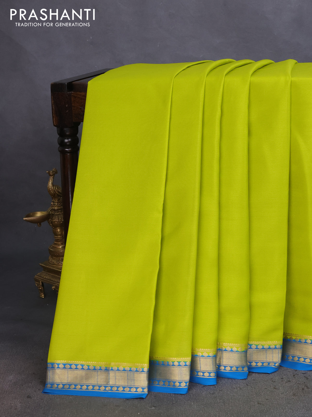 Pure mysore silk saree lime green and cs blue with plain body and zari woven border