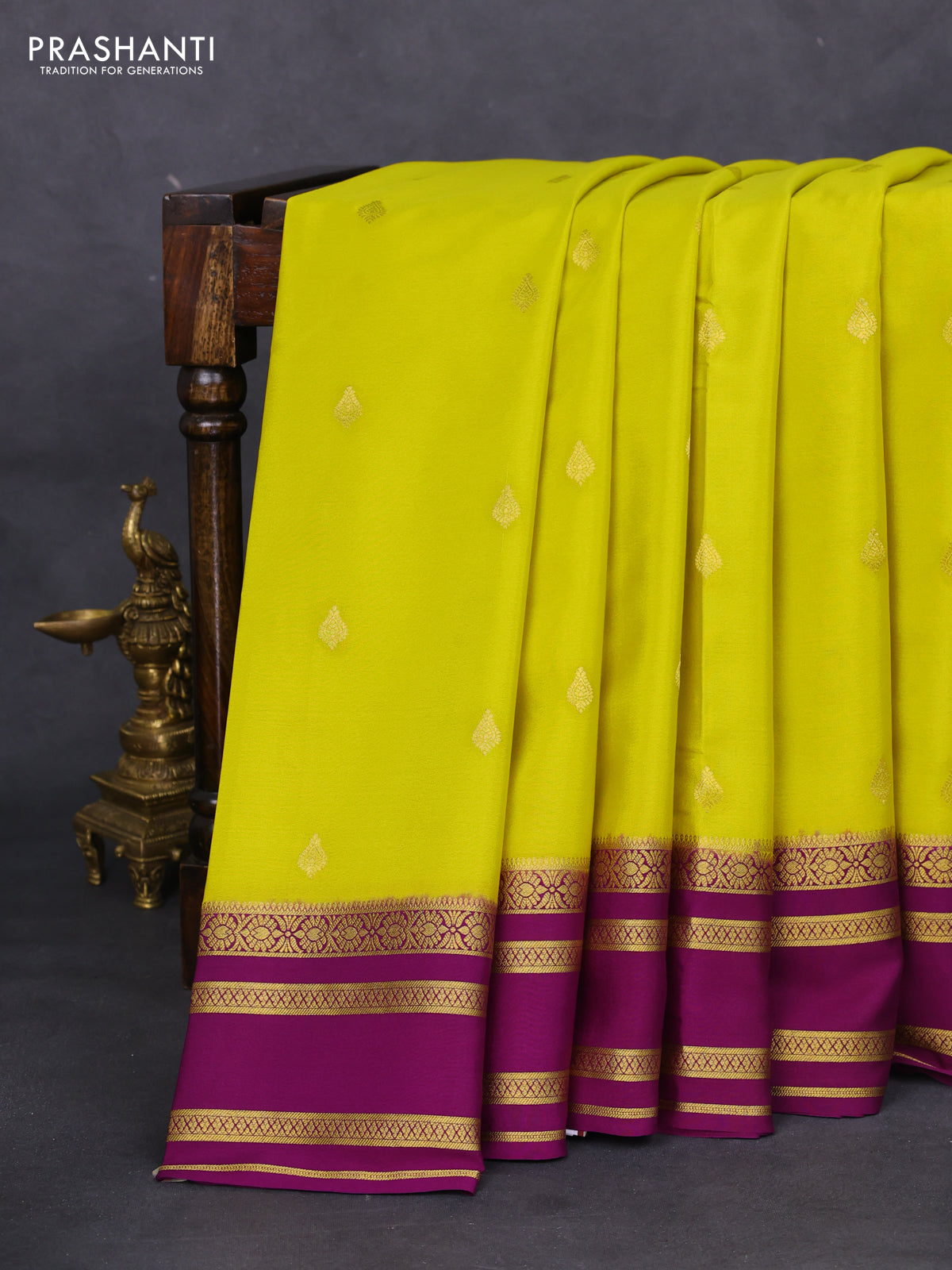 Pure mysore silk saree lime yellow and purple with zari woven buttas and zari woven border