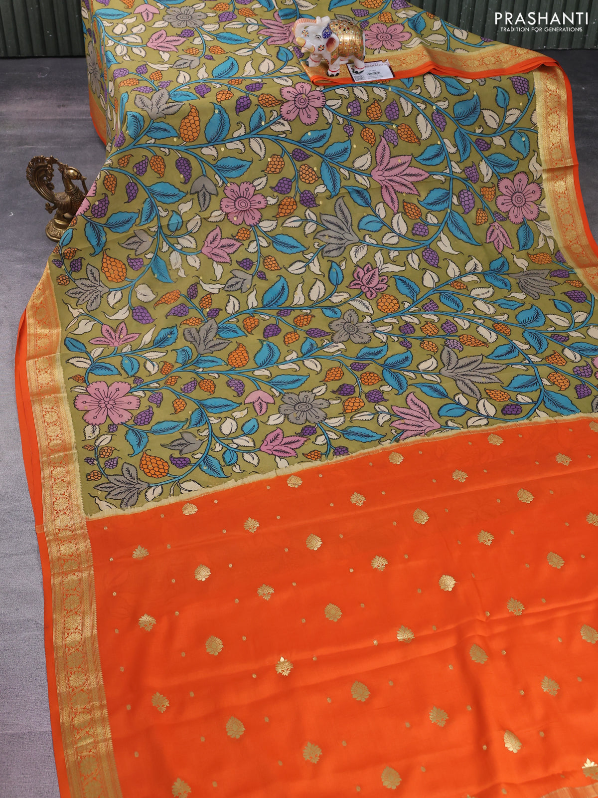Pure mysore silk saree mehendi green and orange with allover pen kalamkari prints and zari woven border