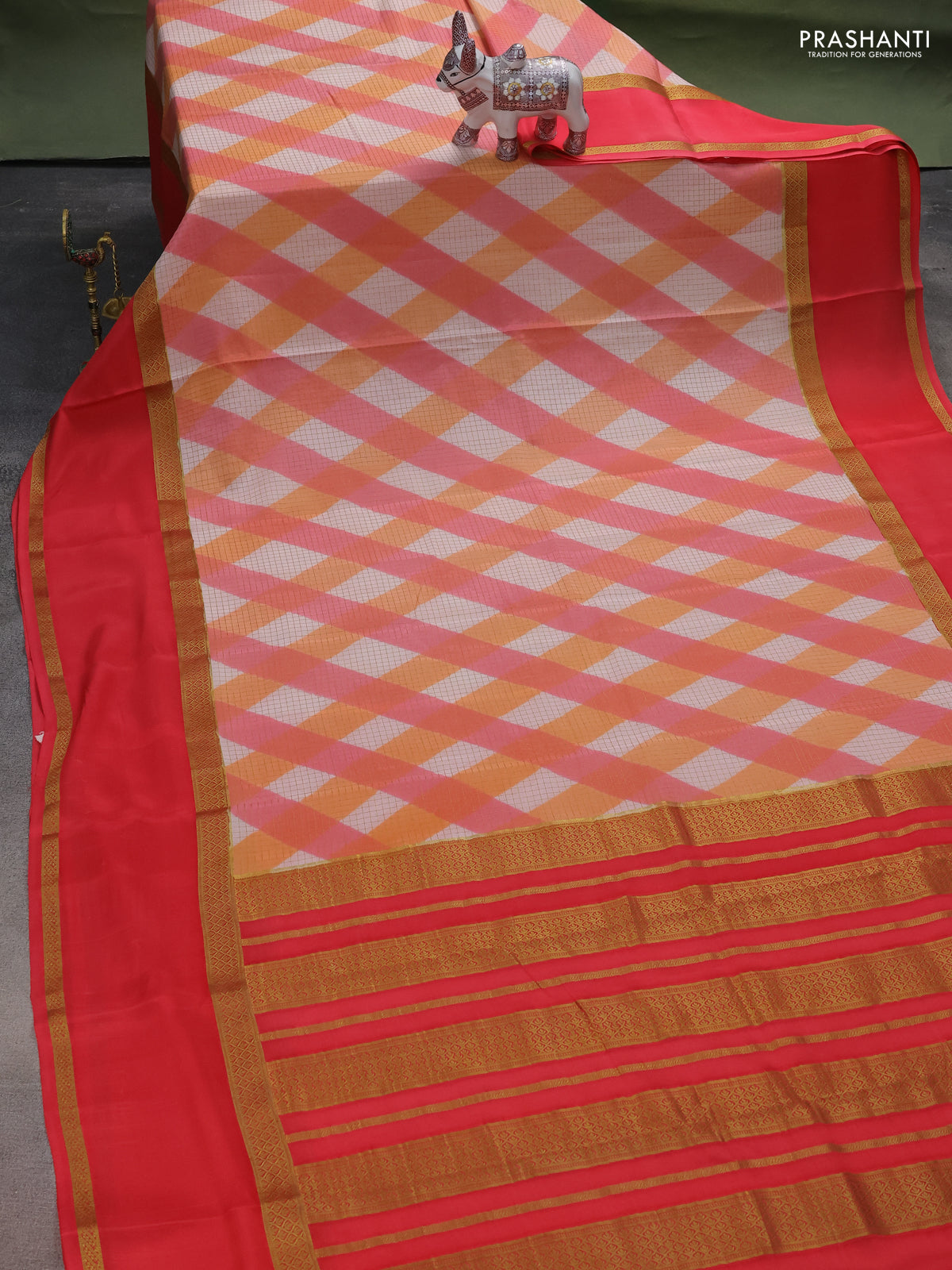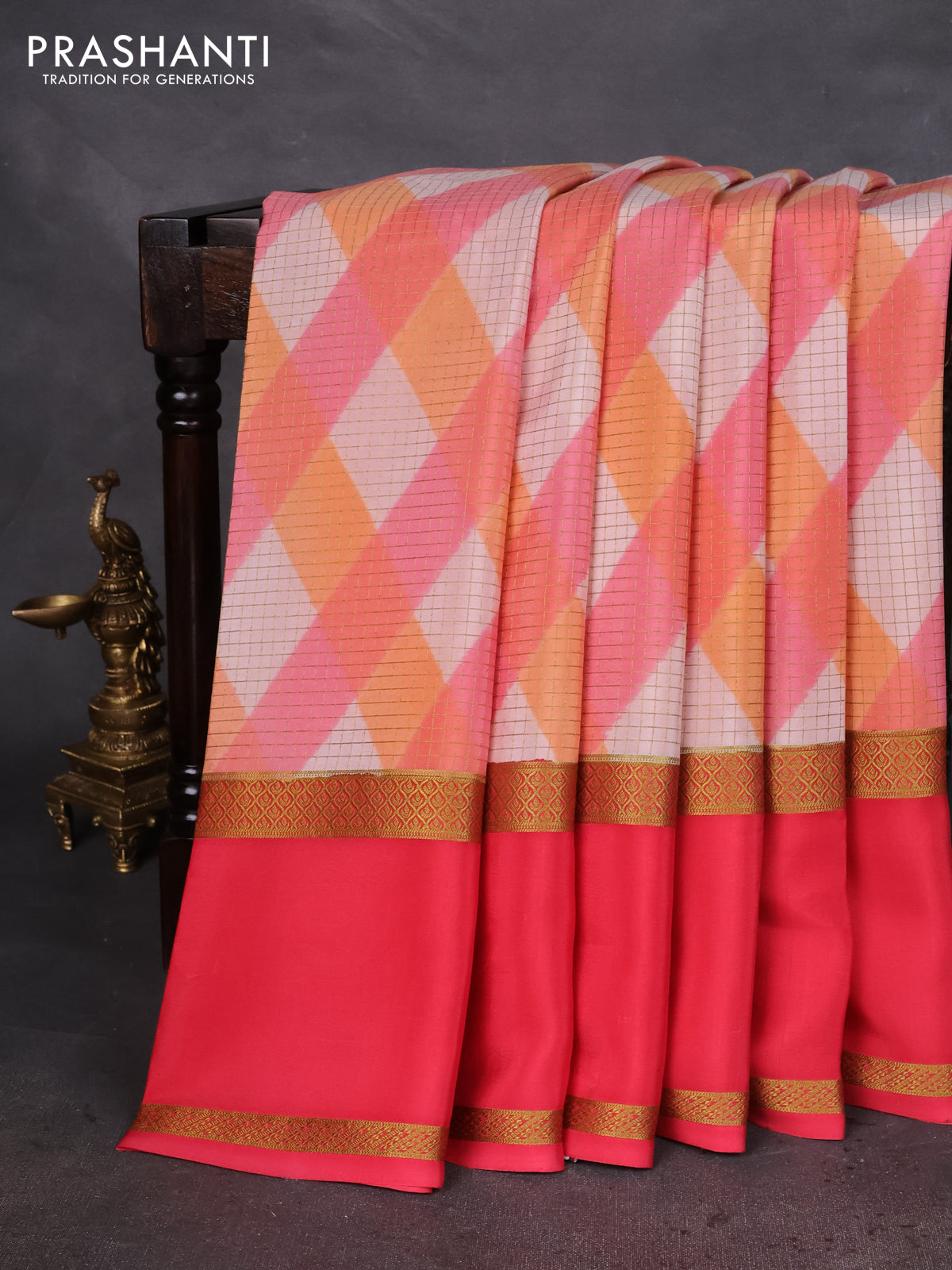 Pure mysore silk saree multi colour and dark peach with allover checks & geometric prints and rettapet zari woven border