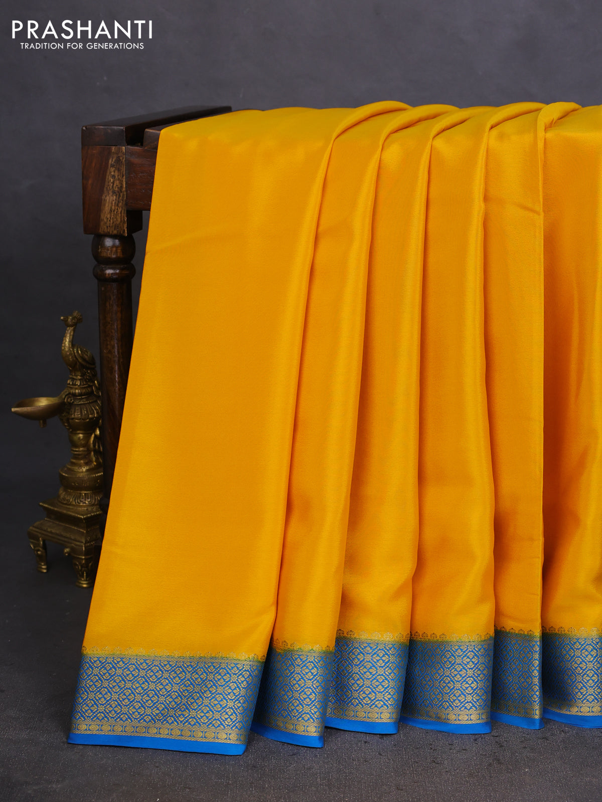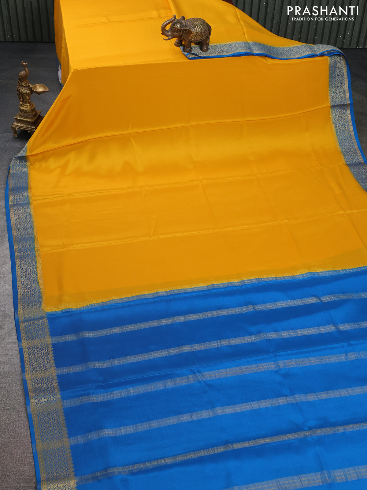 Pure mysore silk saree mustard yellow and cs blue with plain body and zari woven border