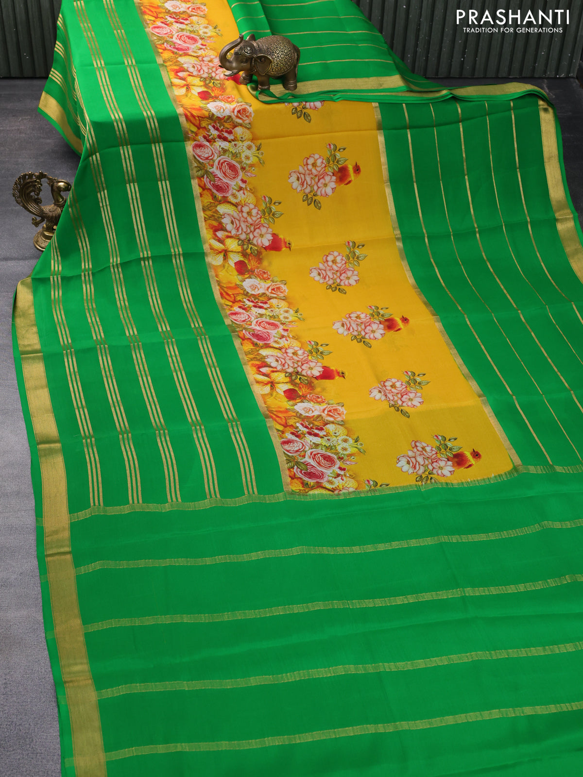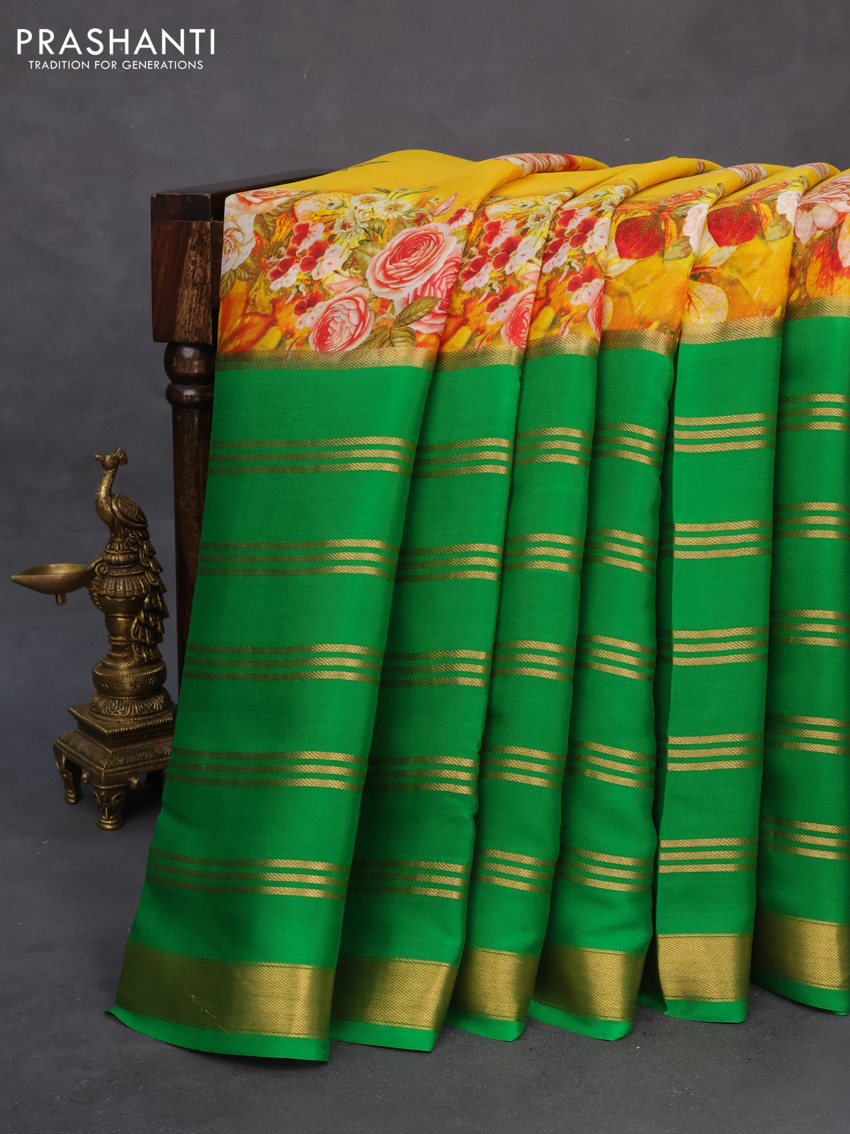 Pure mysore silk saree mustard yellow and green with floral digital prints and long zari woven border