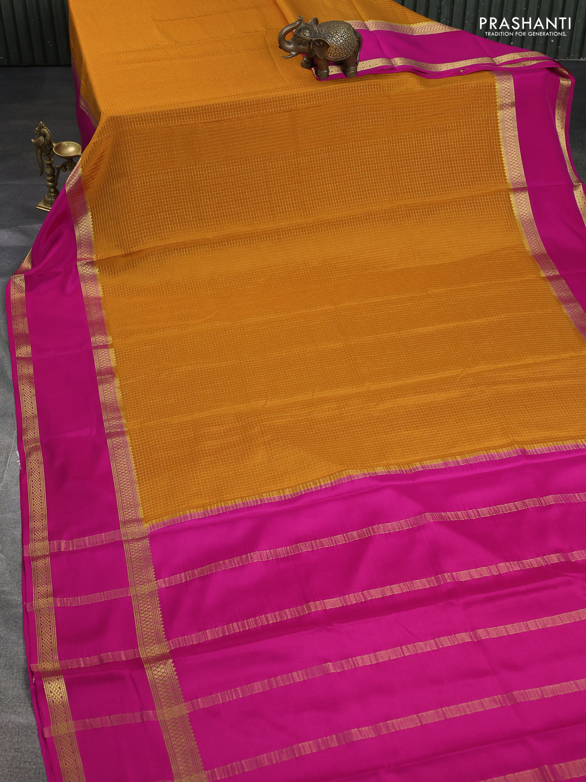 Pure mysore silk saree mustard yellow and pink with allover zari checked pattern and rettapet zari woven border