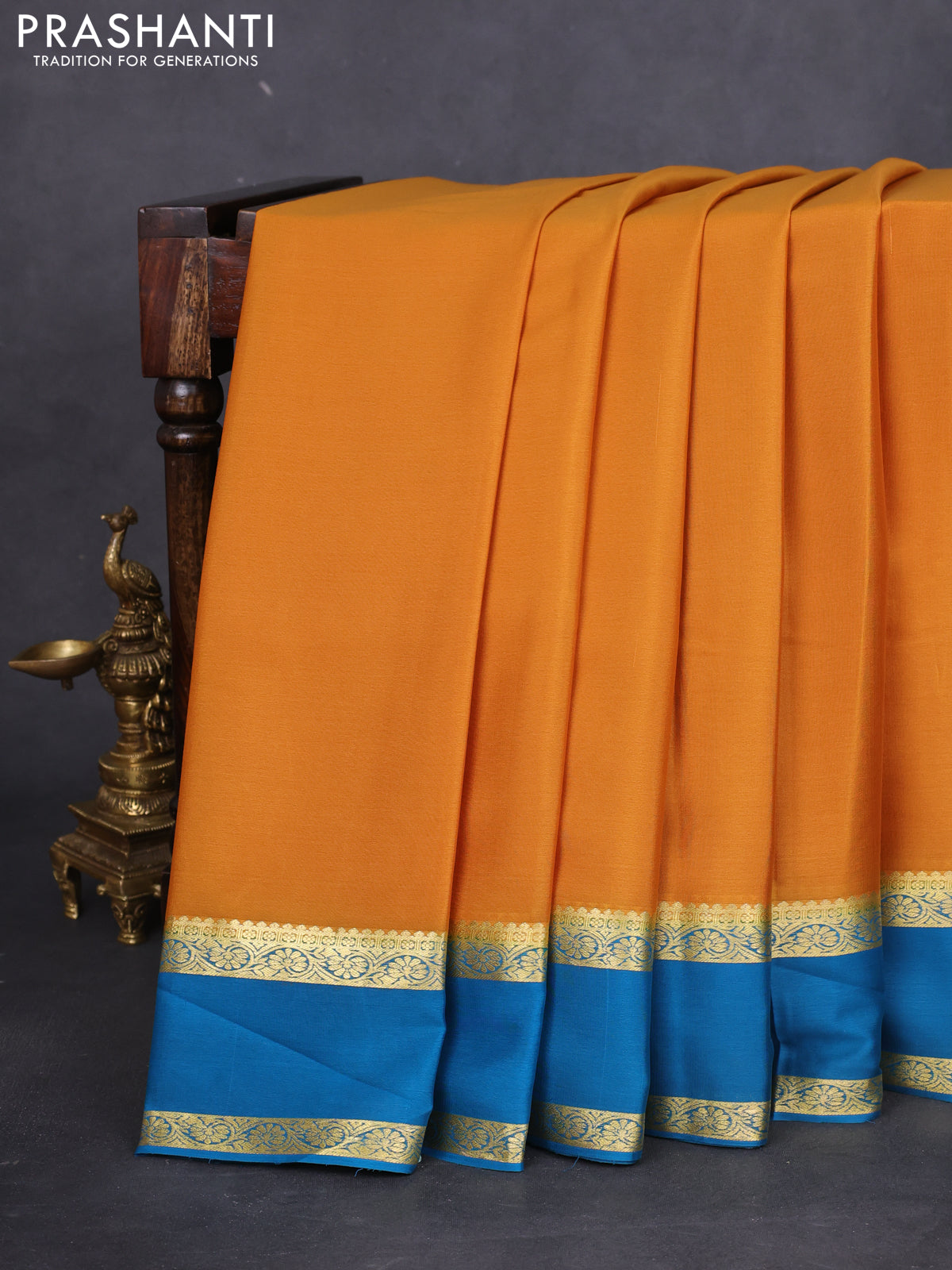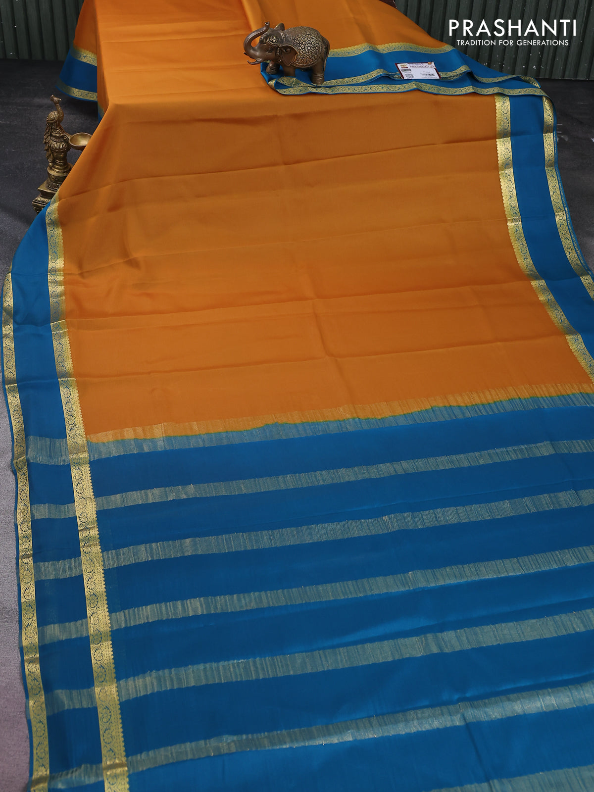 Pure mysore silk saree mustard yelow and cs blue with plain body and rettapet zari woven border