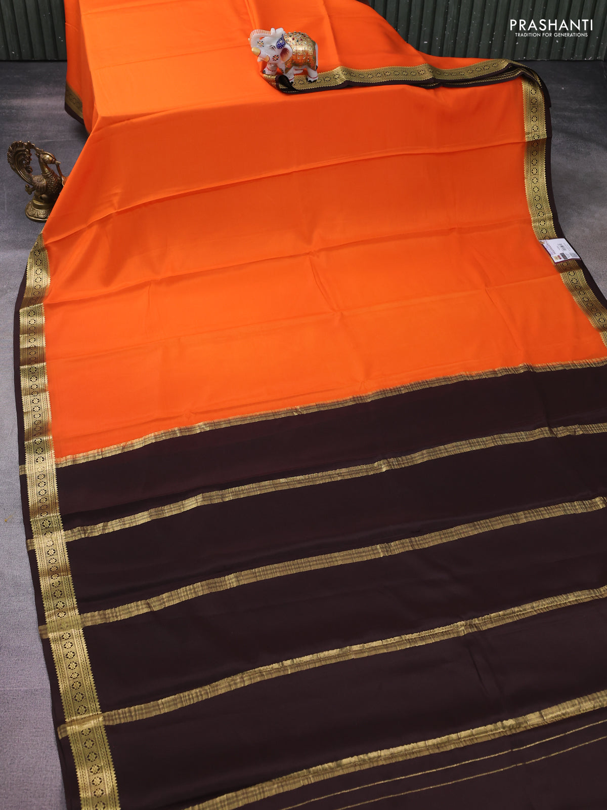 Pure mysore silk saree orange and coffee brown with plain body and zari woven border