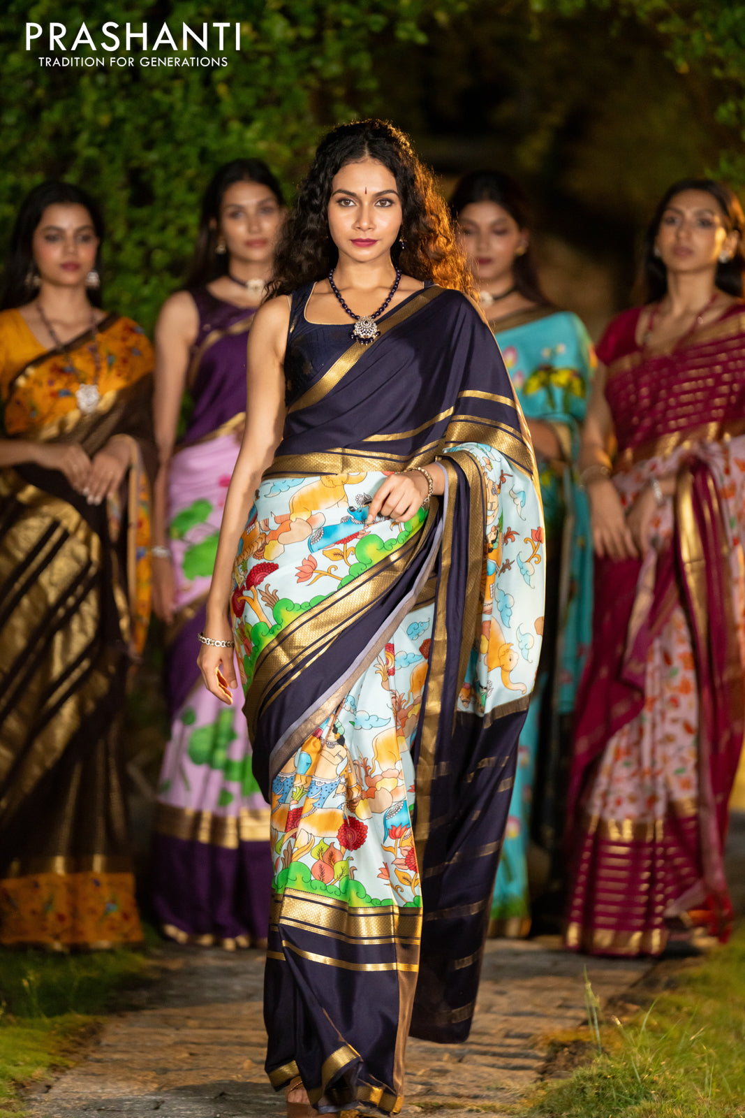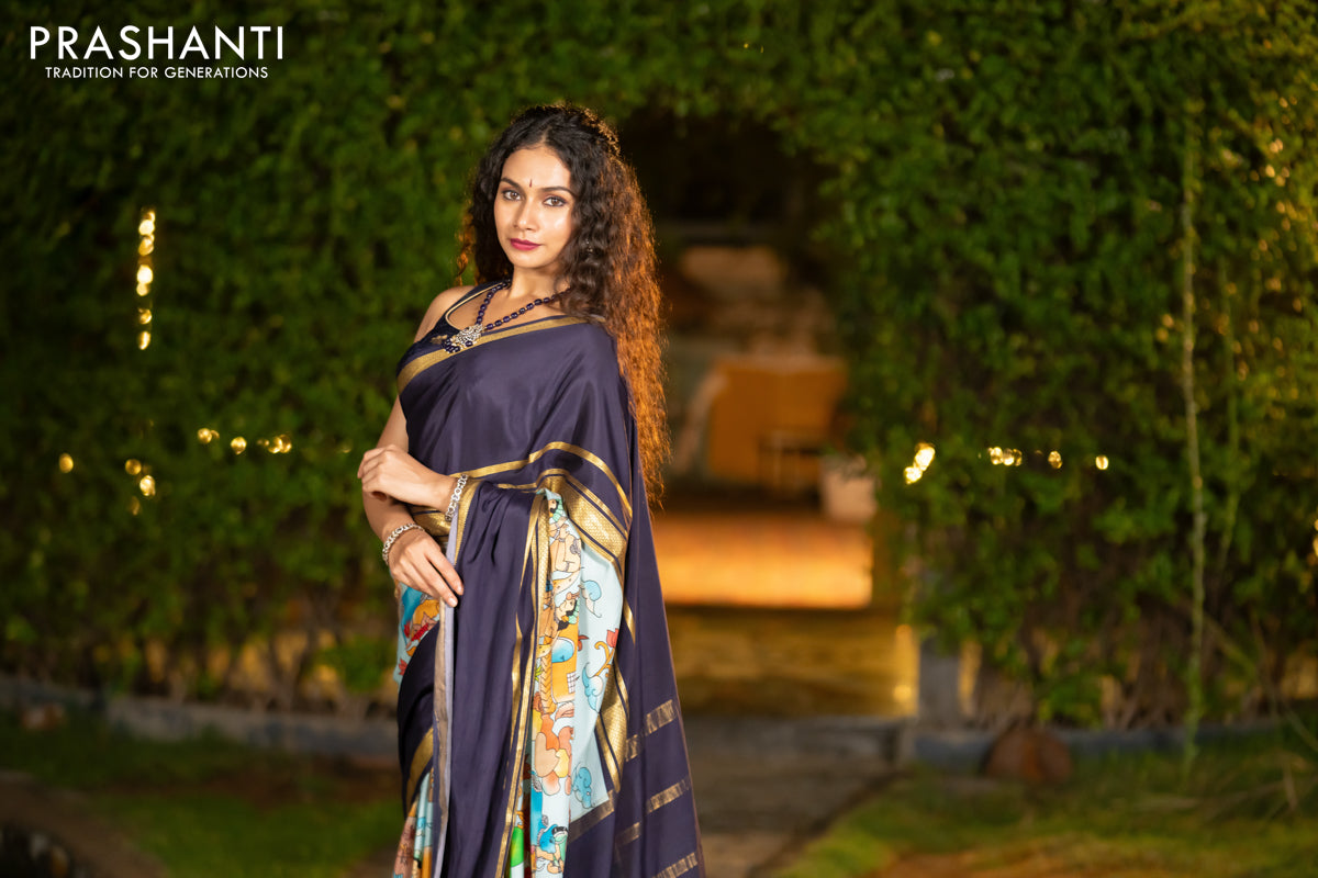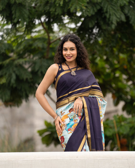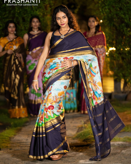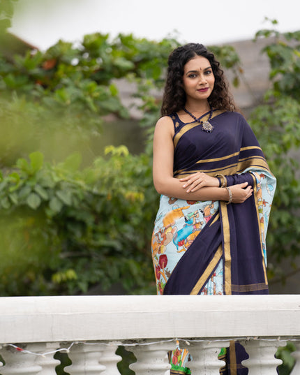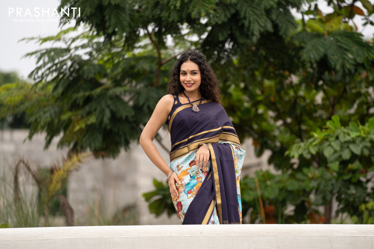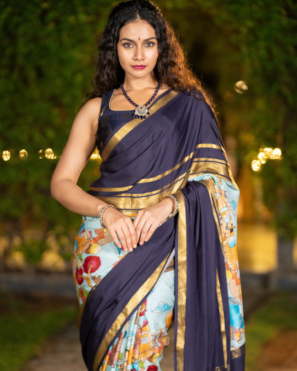 Pure mysore silk saree pastel blue and navy blue with pichwai prints and rettapet zari woven border