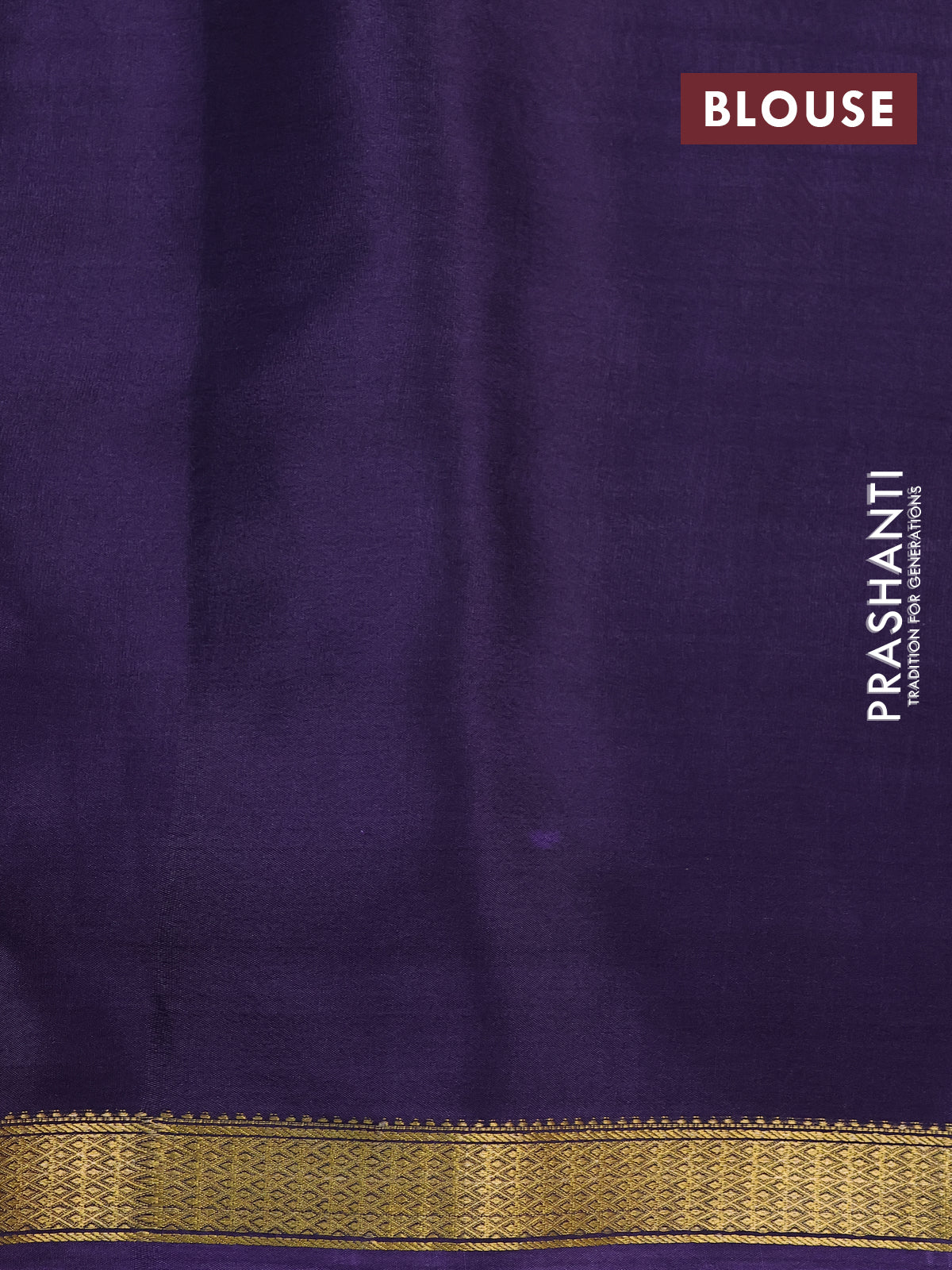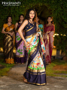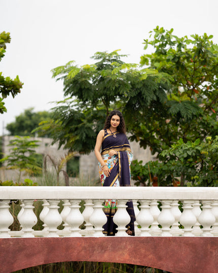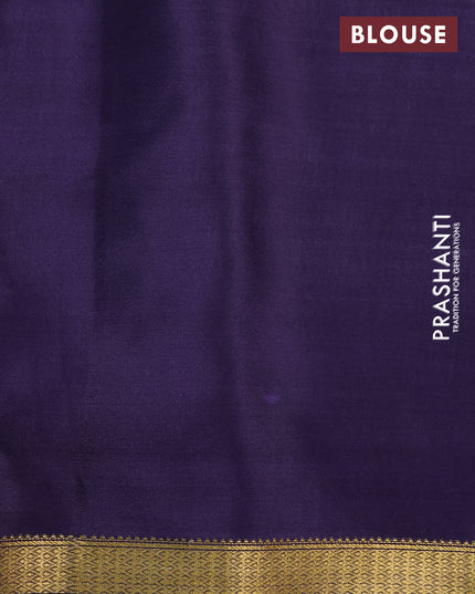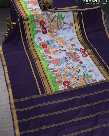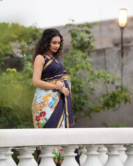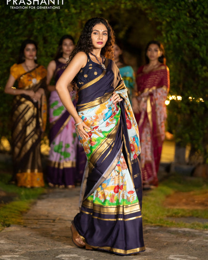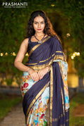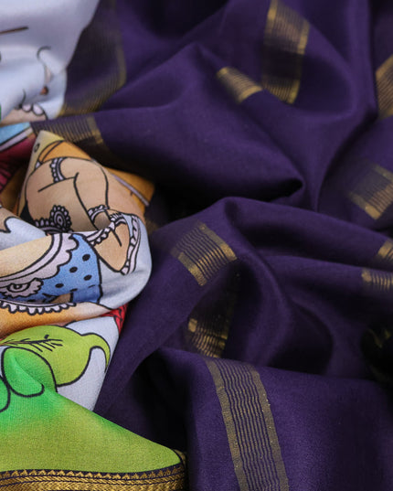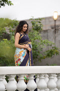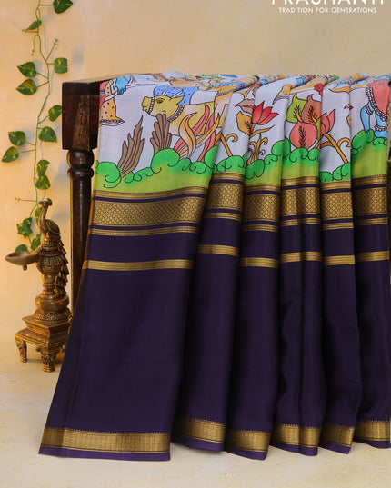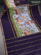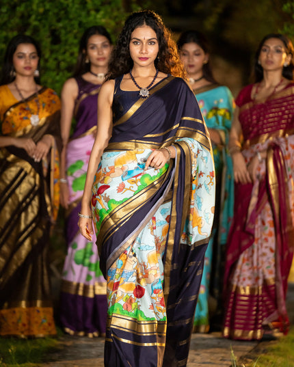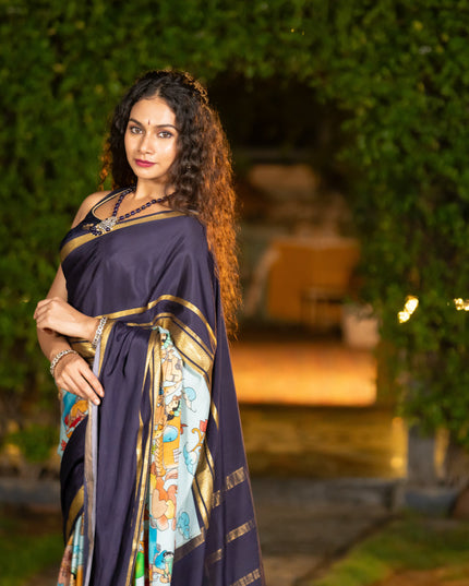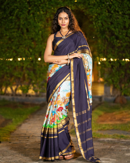 Pure mysore silk saree pastel blue and navy blue with pichwai prints and rettapet zari woven border