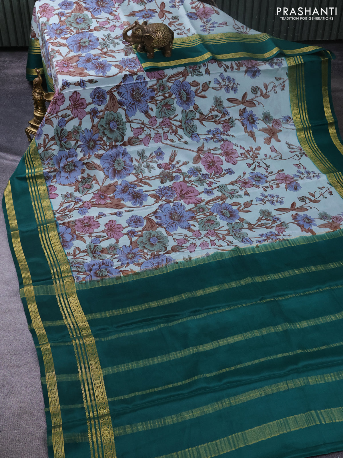 Pure mysore silk saree pastel green and green with floral digital prints and rettapet zari woven border