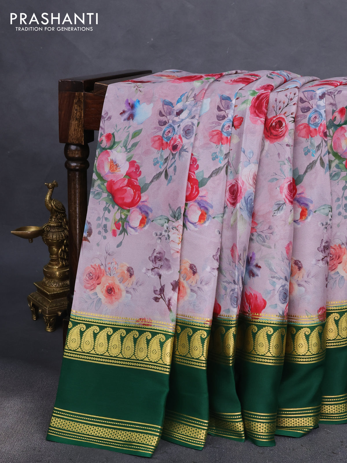 Pure mysore silk saree pastel purple and green with allover floral prints and zari woven border