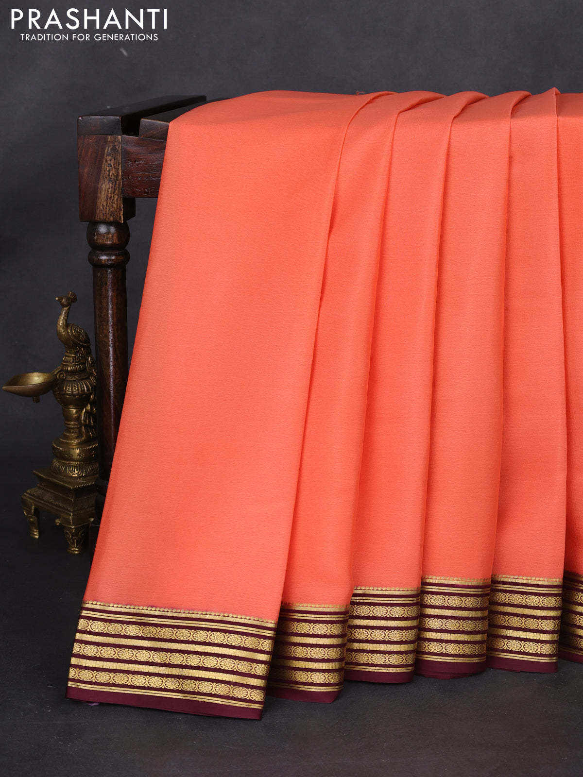Pure mysore silk saree peach orange and brown with plain body and zari woven border