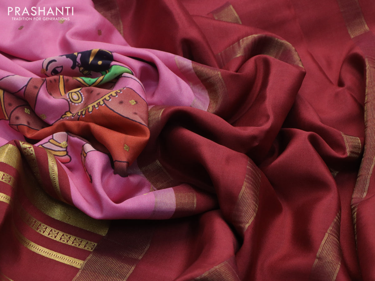 Pure mysore silk saree peach pink and maroon shade with zari woven buttas & digital prints and long zari woven border