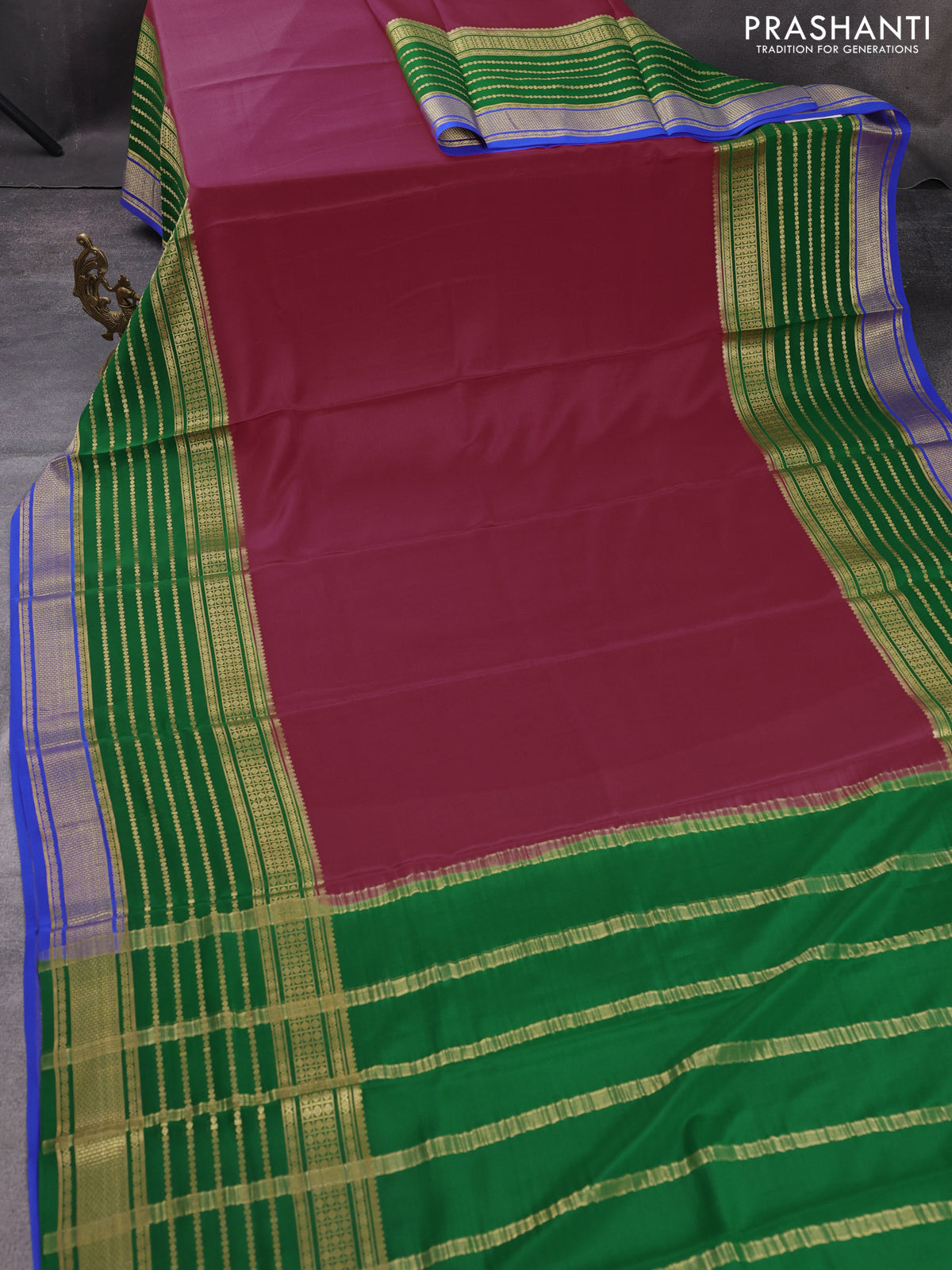 Pure mysore silk saree pink and green blue with plain body and long zari woven border
