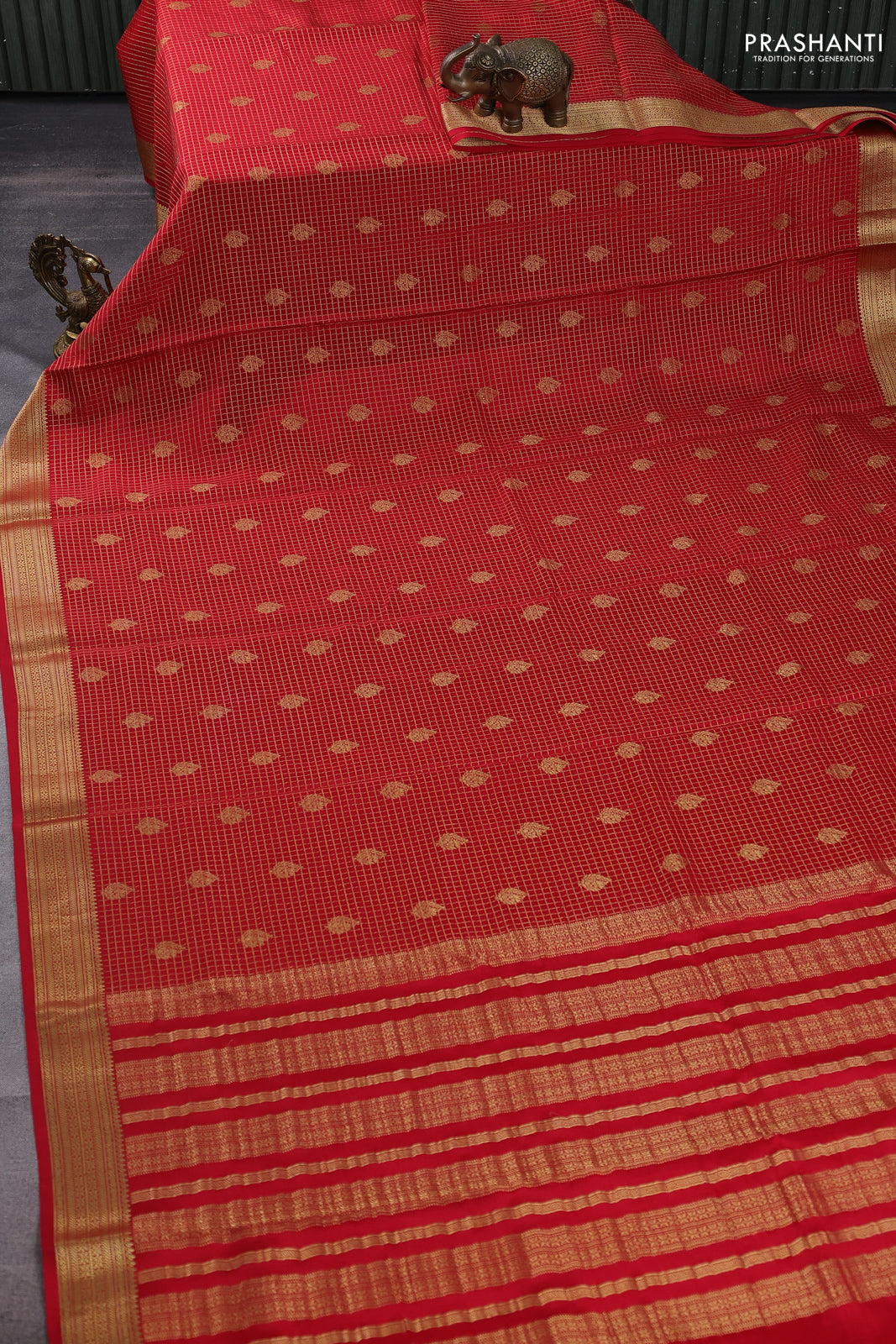 Pure mysore silk saree red with allover small zari checks & buttas and zari woven border