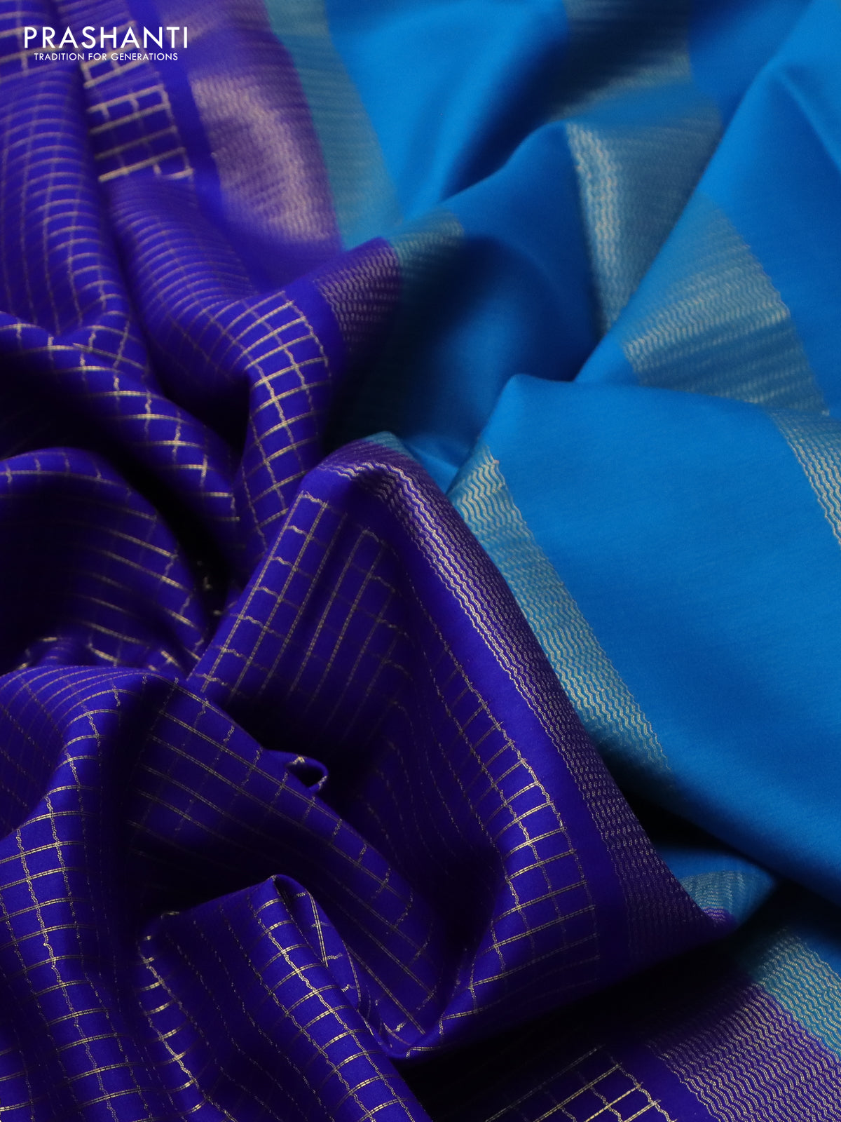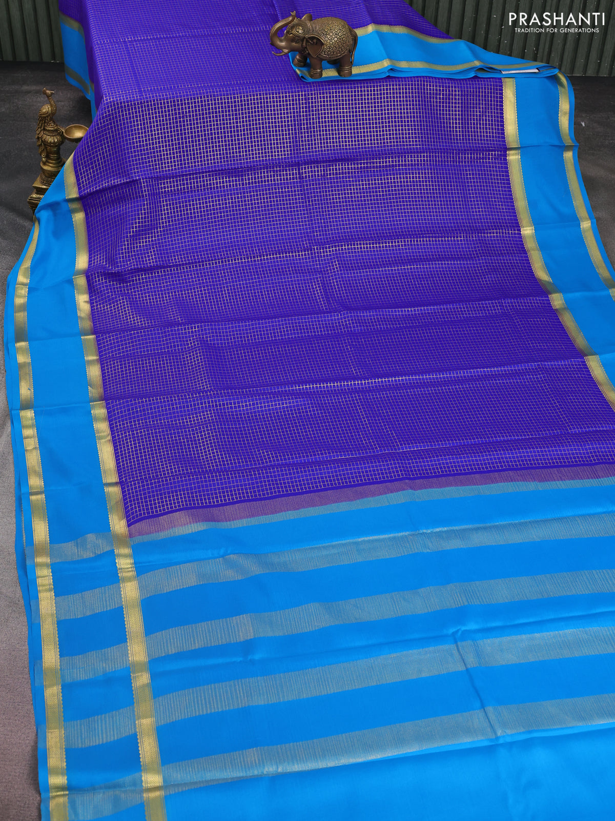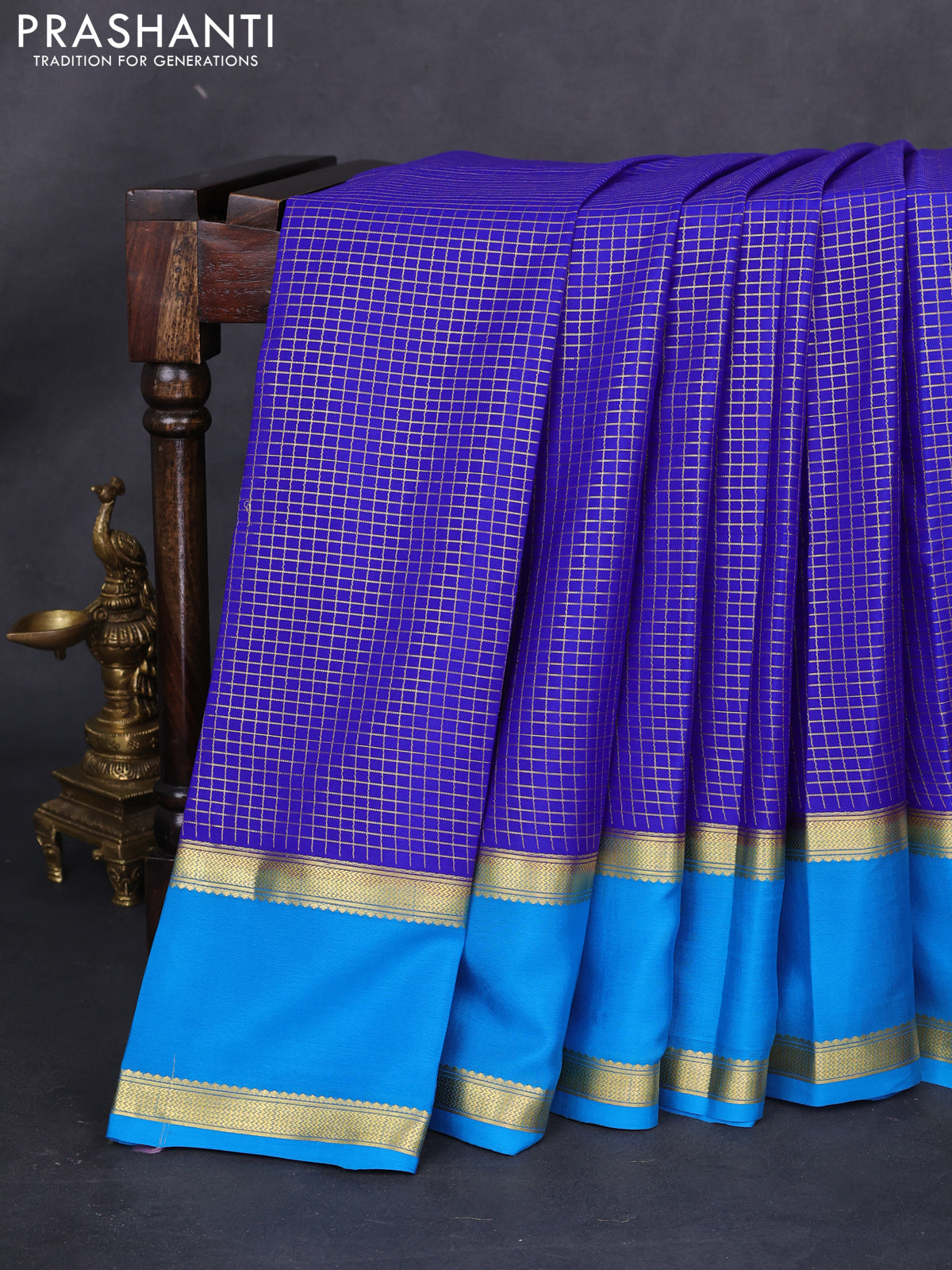 Pure mysore silk saree royal blue and cs blue with allover small zari checked pattern and rettapet zari woven border