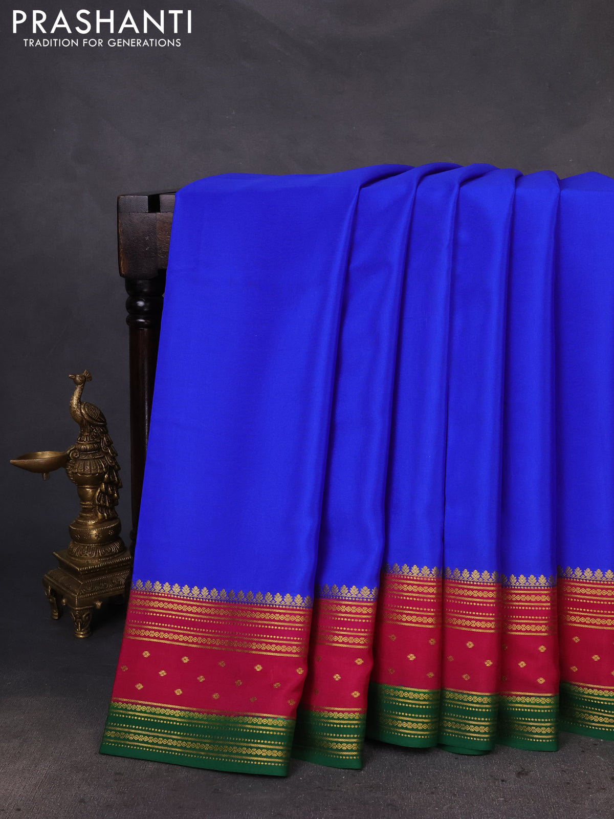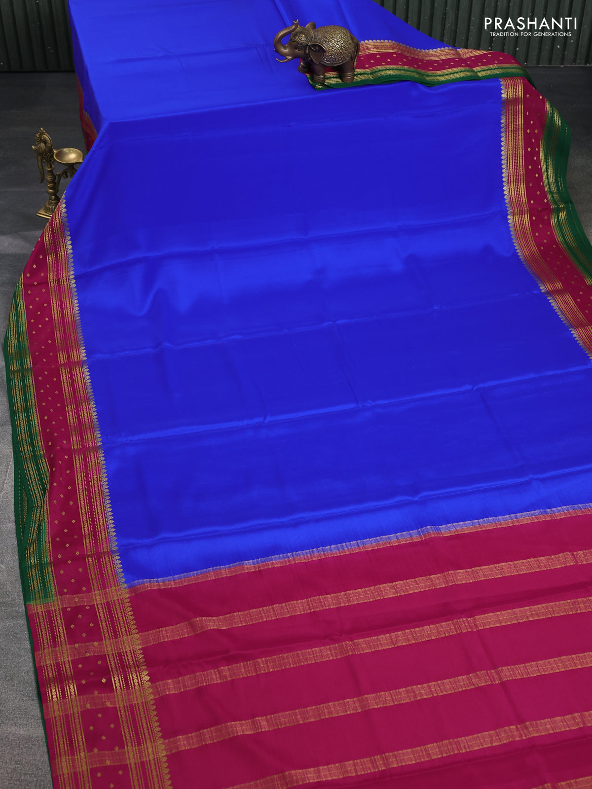 Pure mysore silk saree royal blue and magenta pink green with plain body and zari woven border