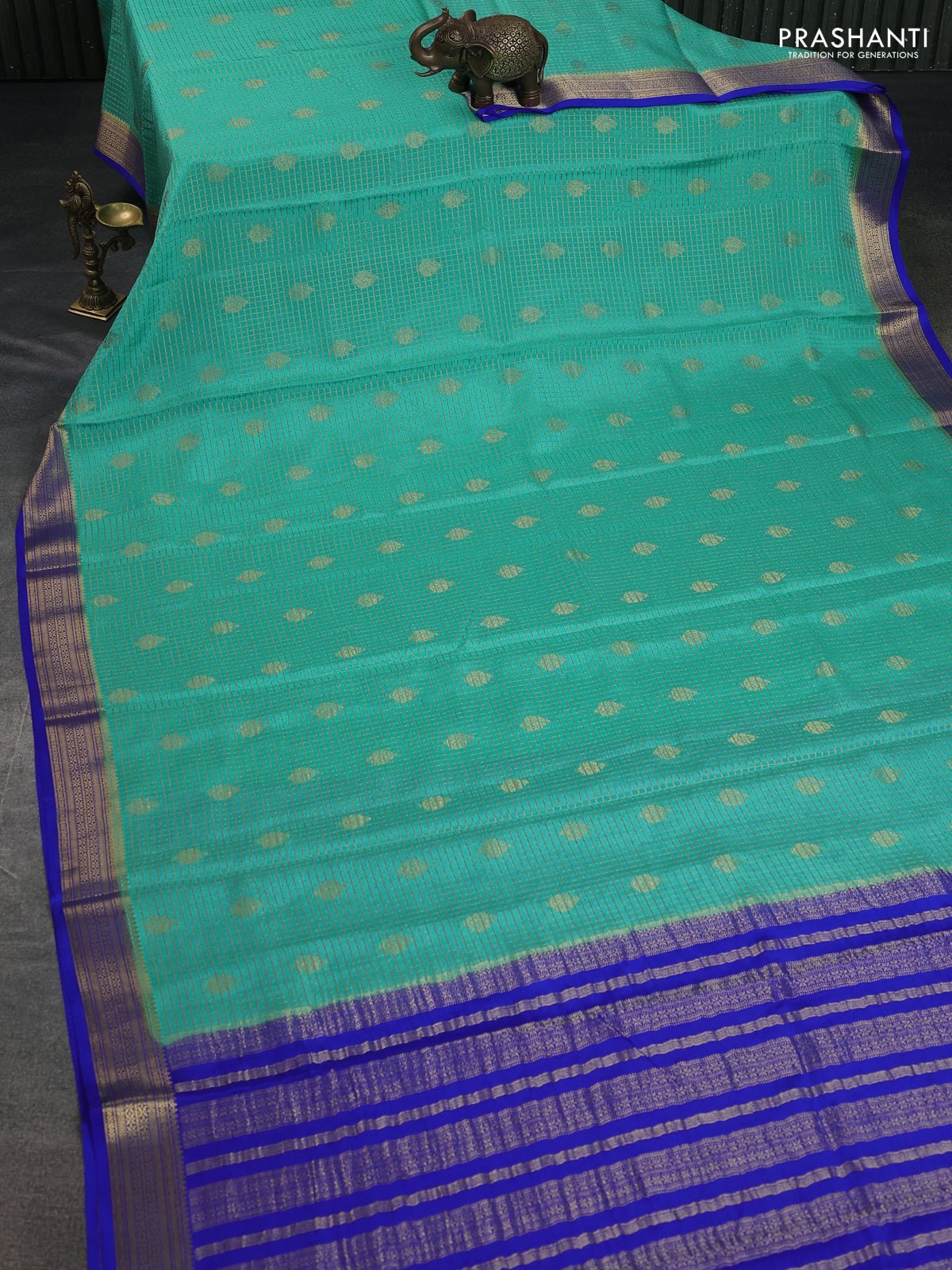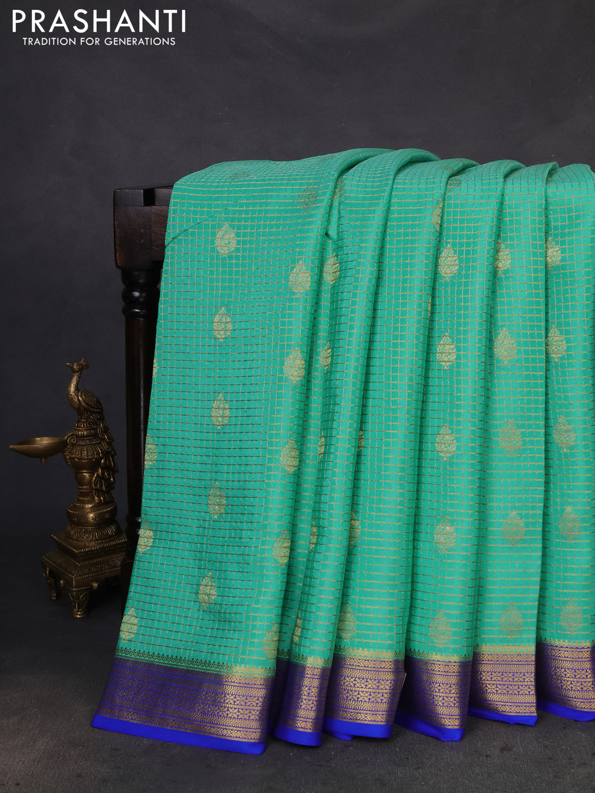 Pure mysore silk saree teal green and royal blue with allover zari checked pattern & buttas and zari woven border