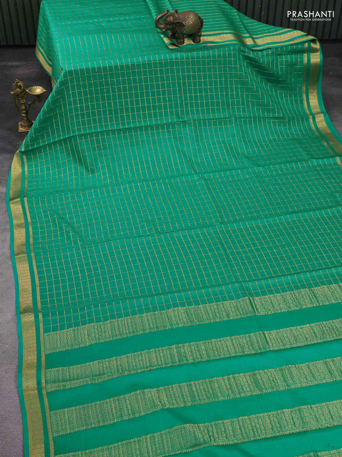 Pure mysore silk saree teal green with allover zari checked pattern and zari woven border