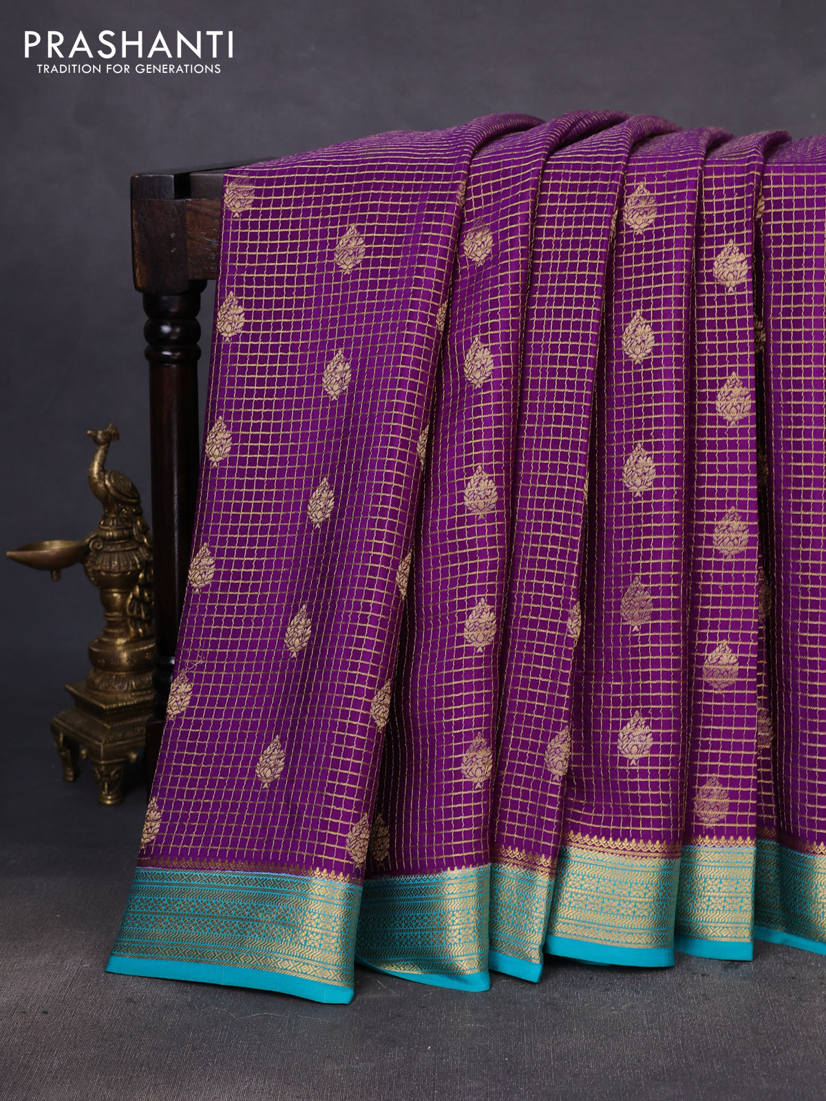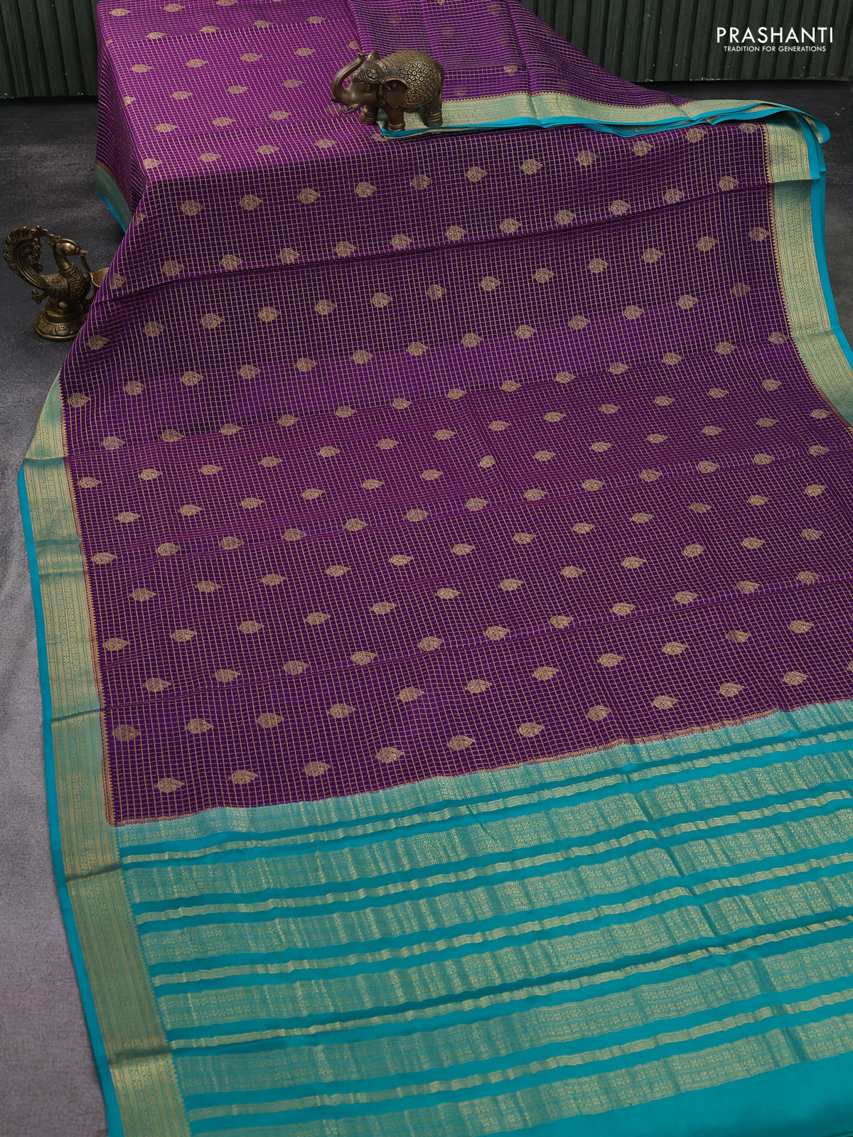 Pure mysore silk saree violet and teal blue with allover zari checked pattern & buttas and zari woven border