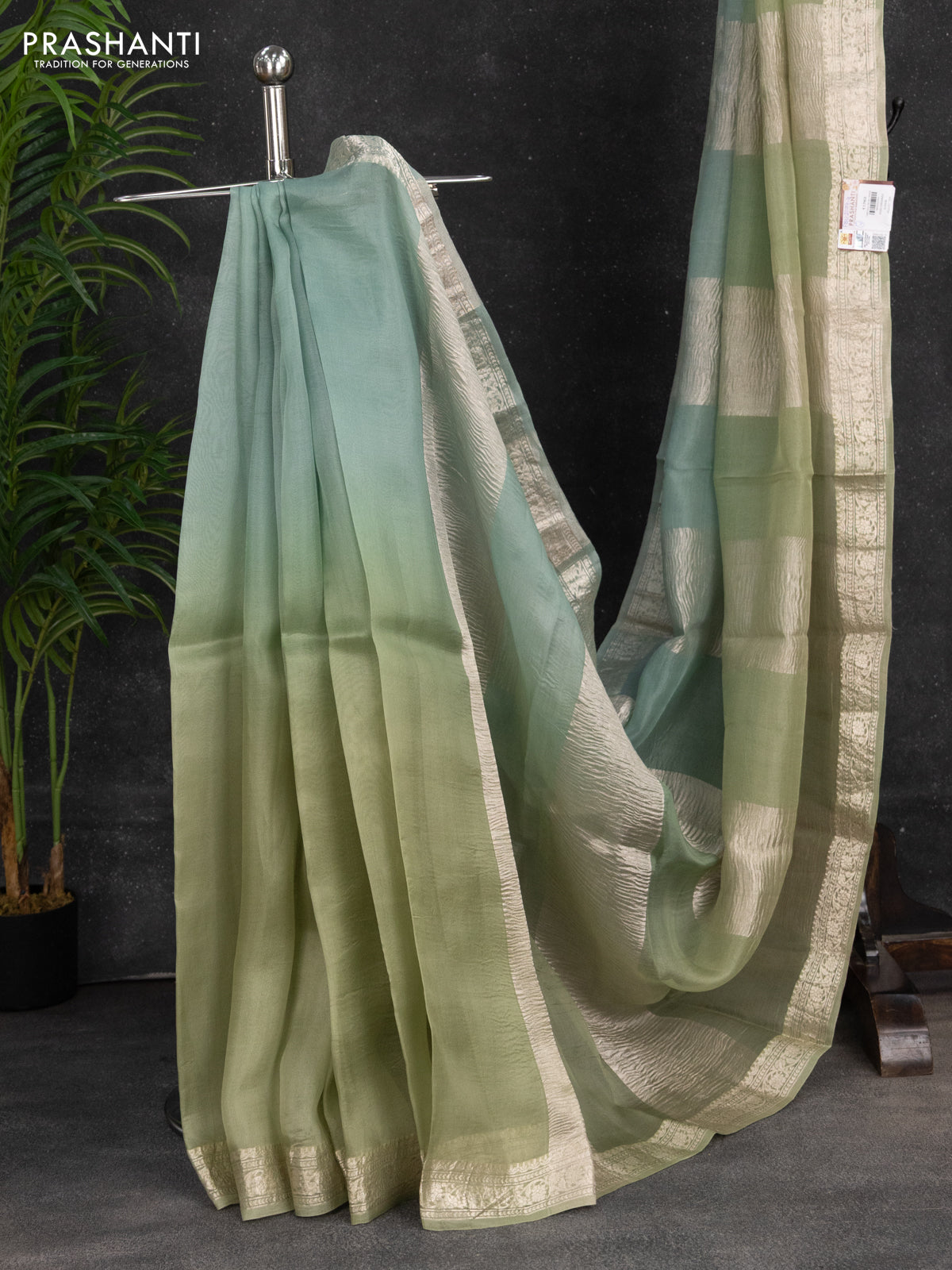 Pure organza partly silk saree pastel green and pastel blue with silver zari stripe pattern and silver zari woven border