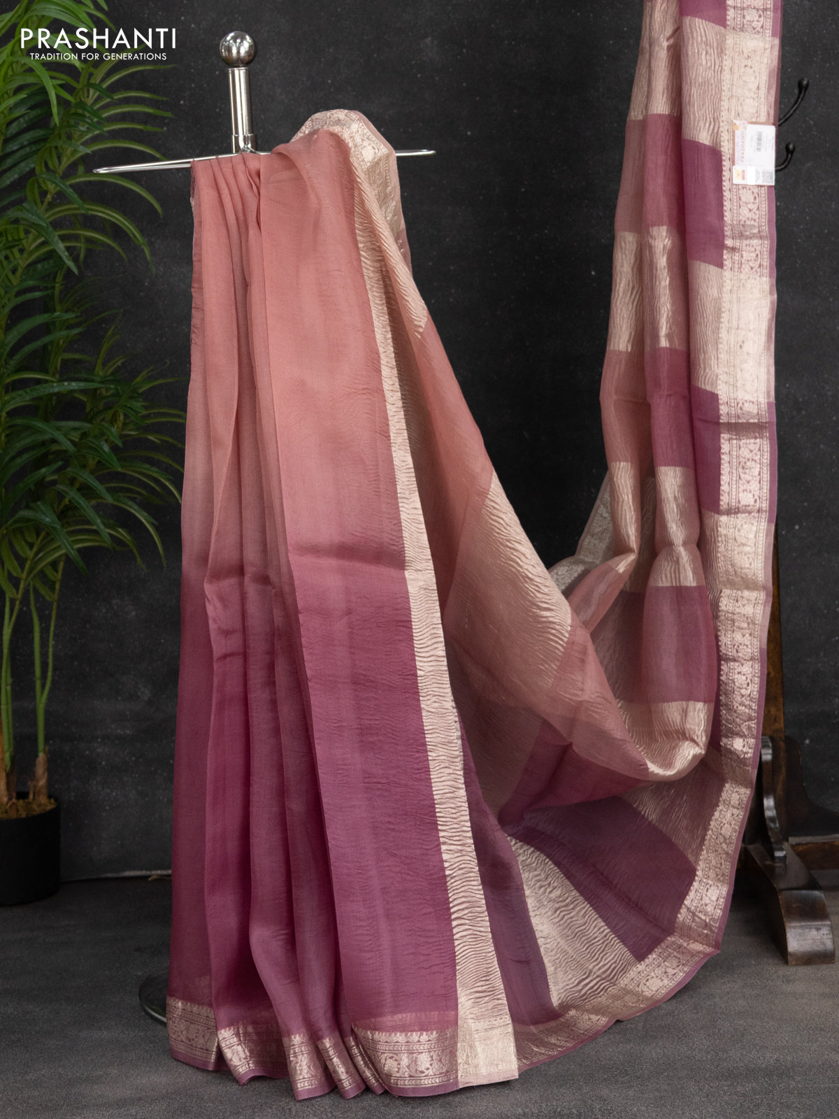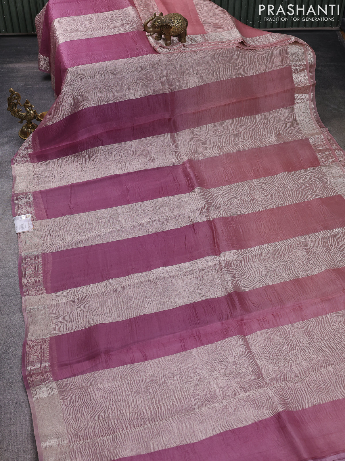 Pure organza partly silk saree pastel peach and pastel pink with silver zari stripe pattern and silver zari woven border