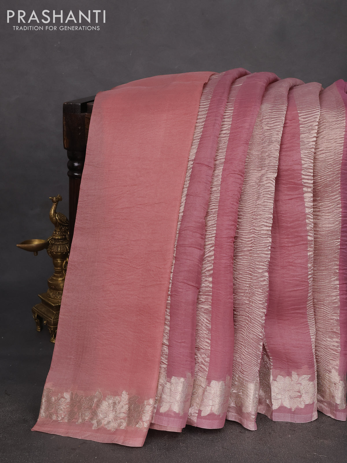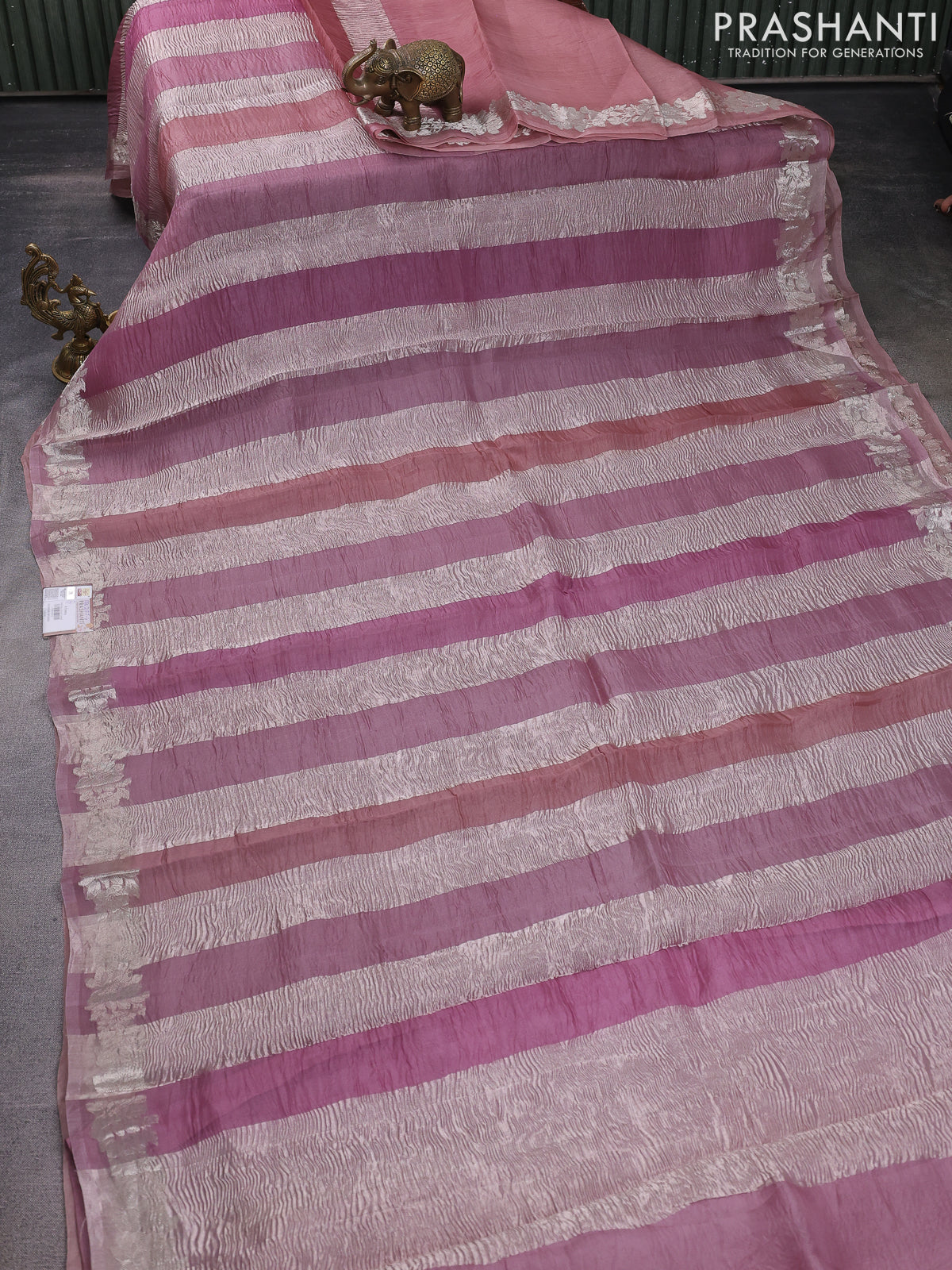 Pure organza partly silk saree pastel pink and pastel peach with silver zari stripe pattern and silver zari woven floral border