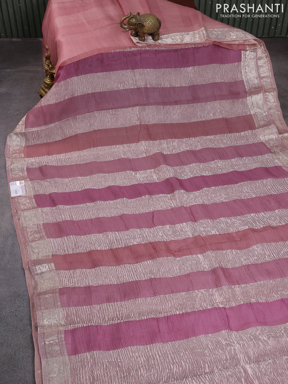 Pure organza partly silk saree pastel pink with allover silver zari weaves and silver zari woven border