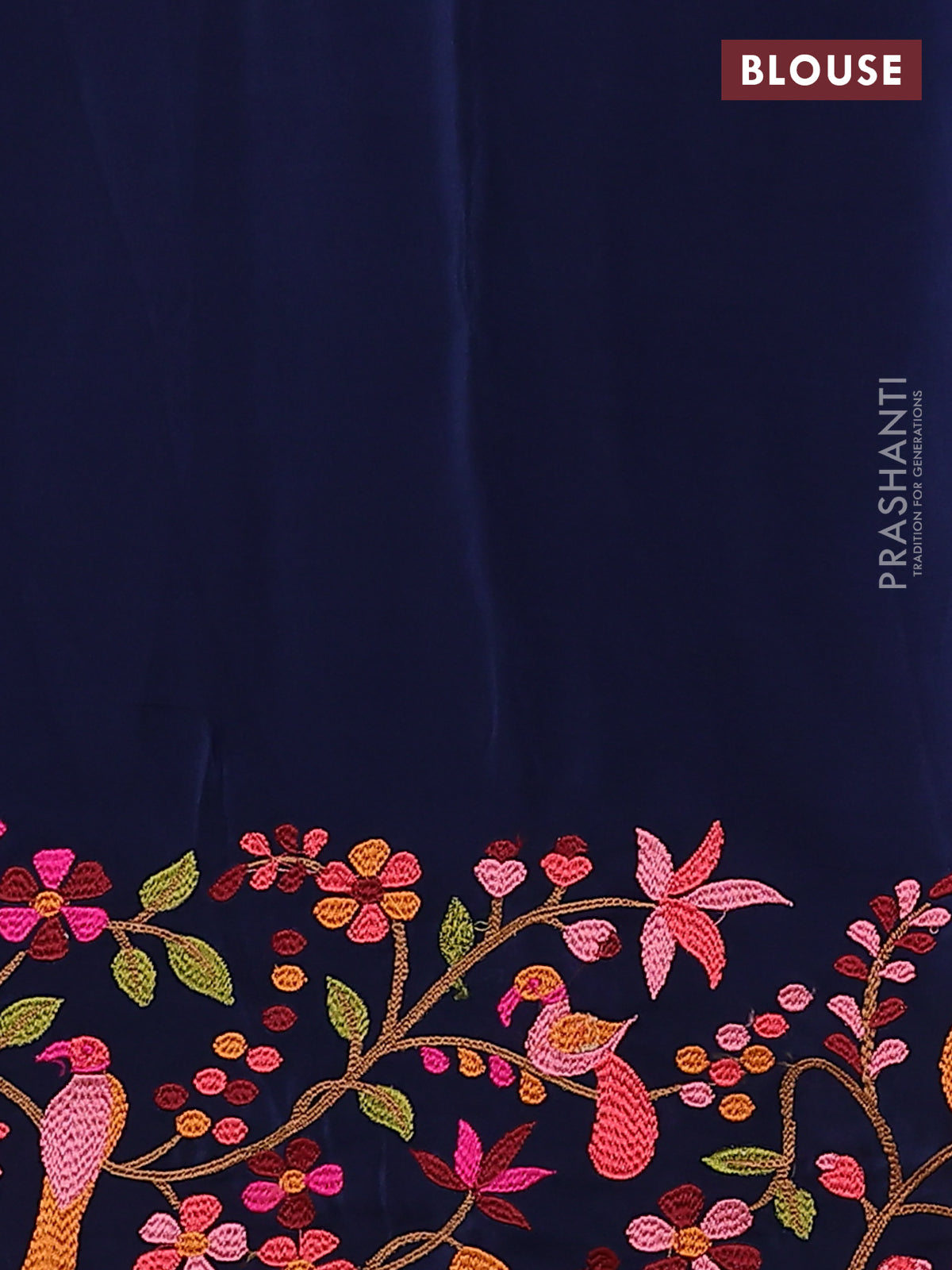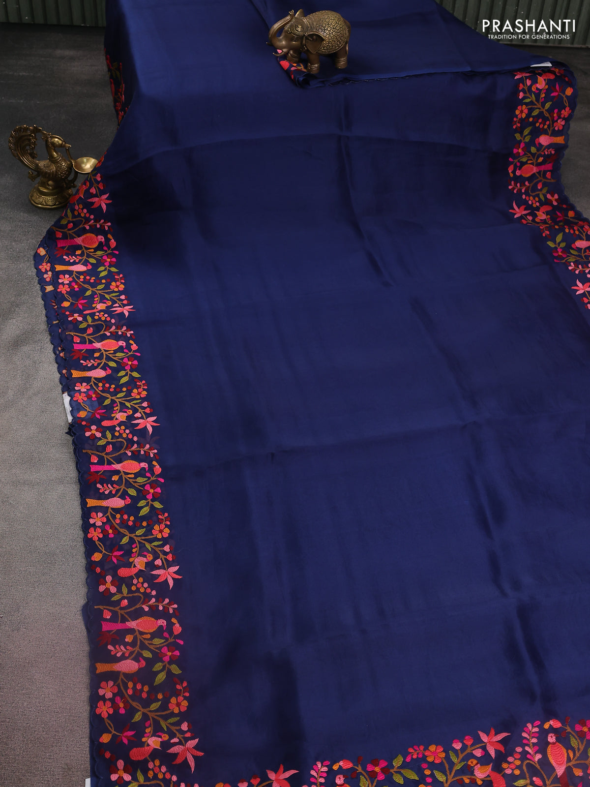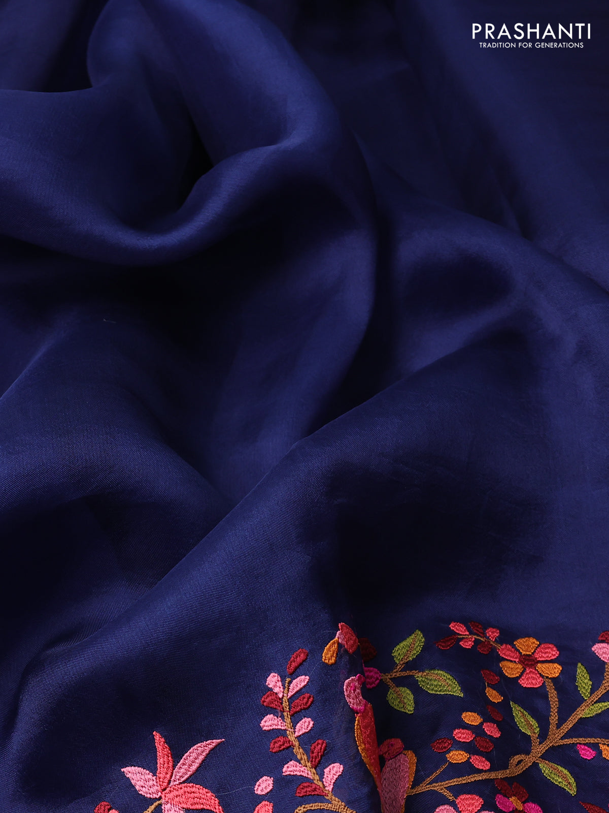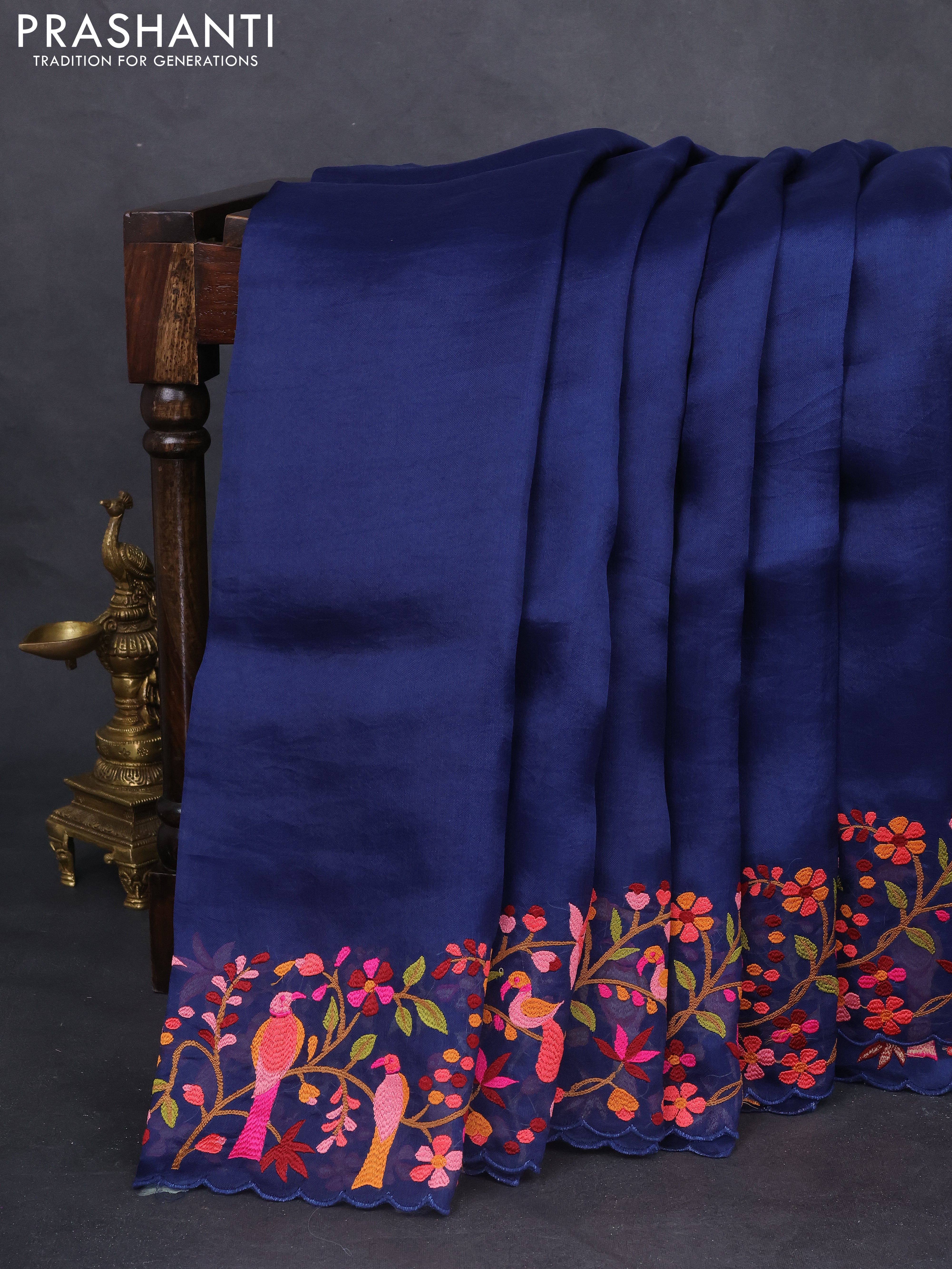 Pure organza silk saree blue with plain body and floral design embroidery border