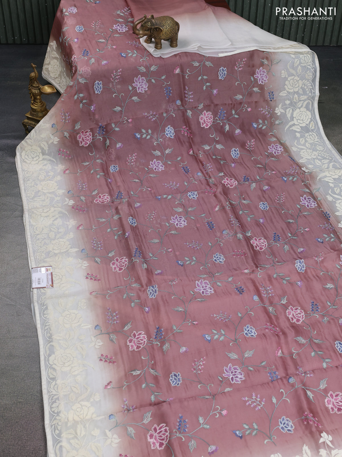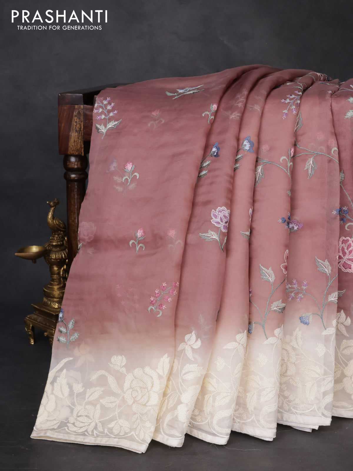 Pure organza silk saree brown shade and cream with allover floral embroidery