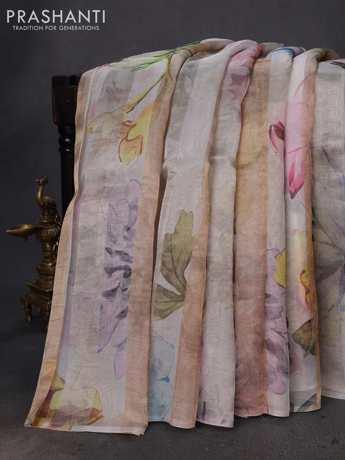 Pure organza silk saree cream with allover floral digital prints & zari stripe pattern in borderless style