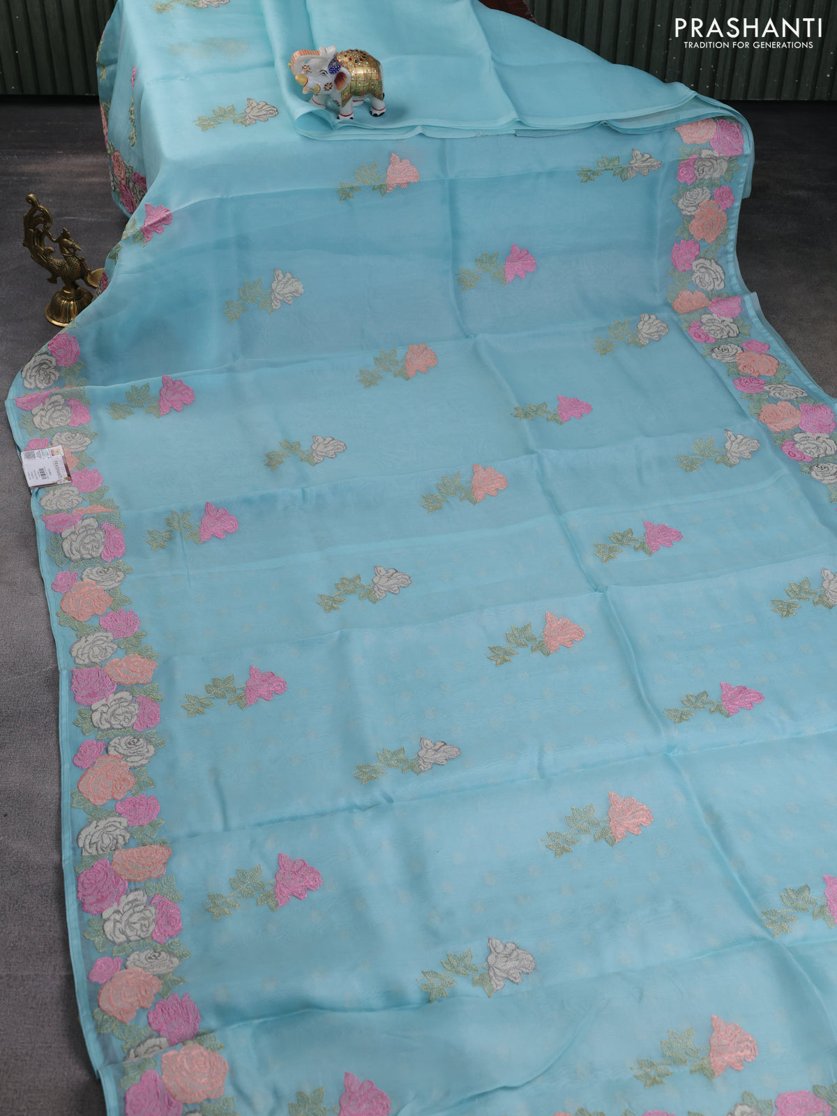 Pure organza silk saree light blue with floral embroidery buttas and floral embroidery border