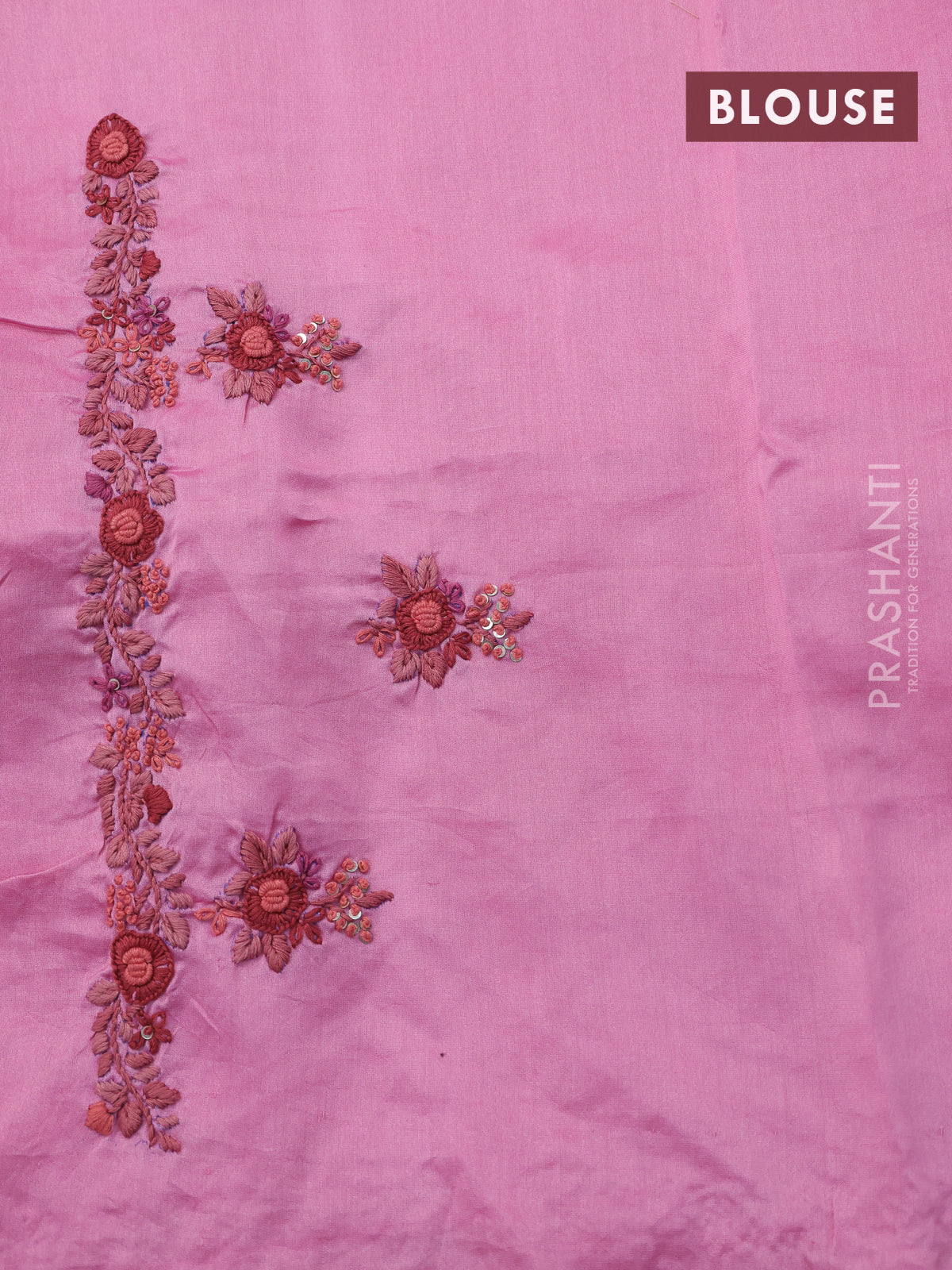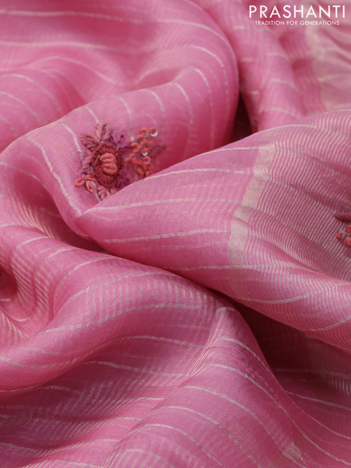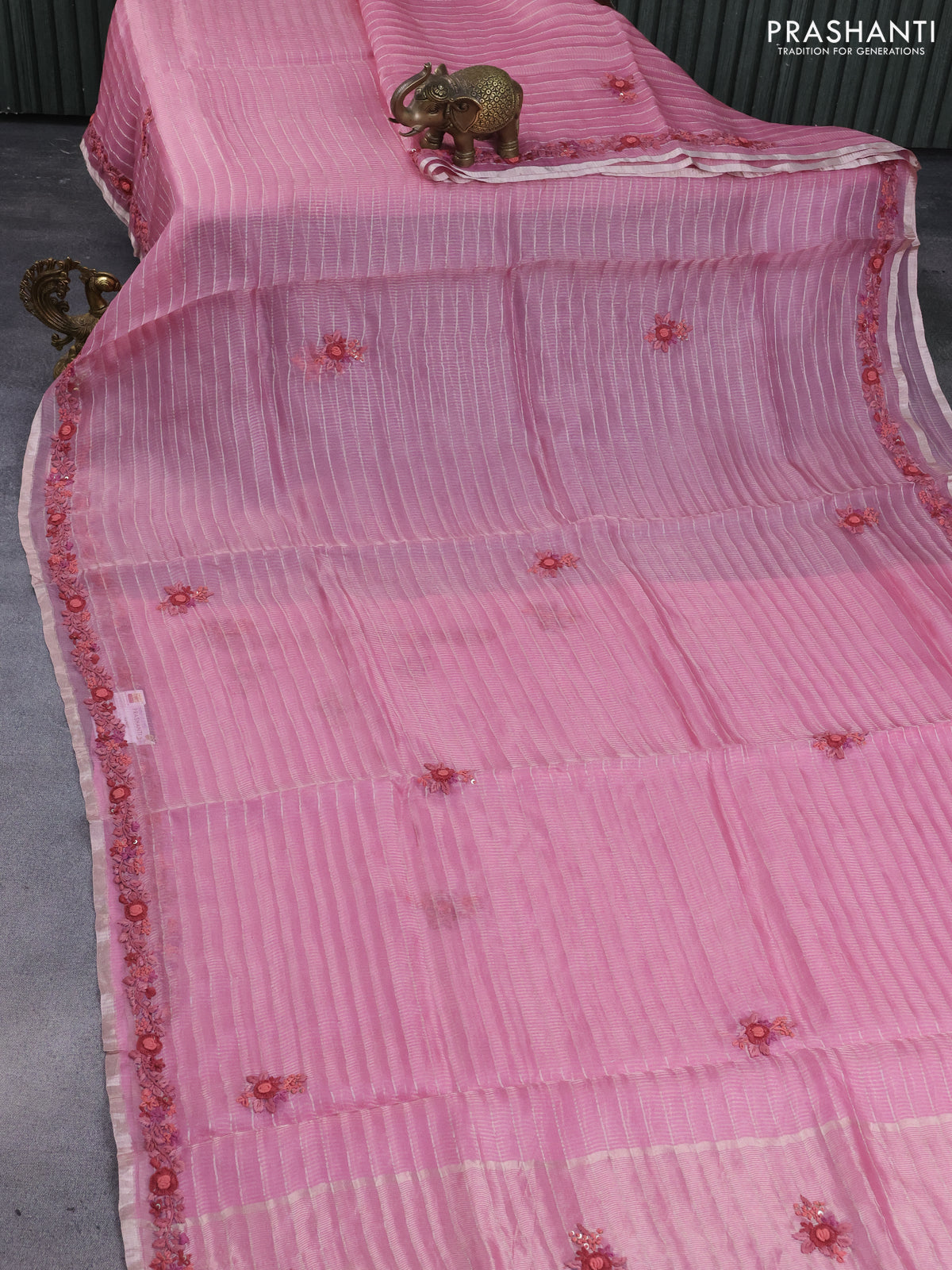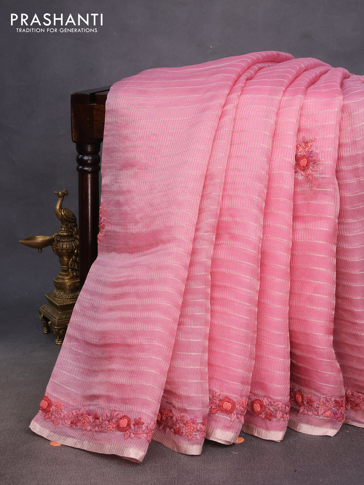 Pure organza silk saree light pink with allover stripes pattern & embroidery work buttas and embroidery sequin work border