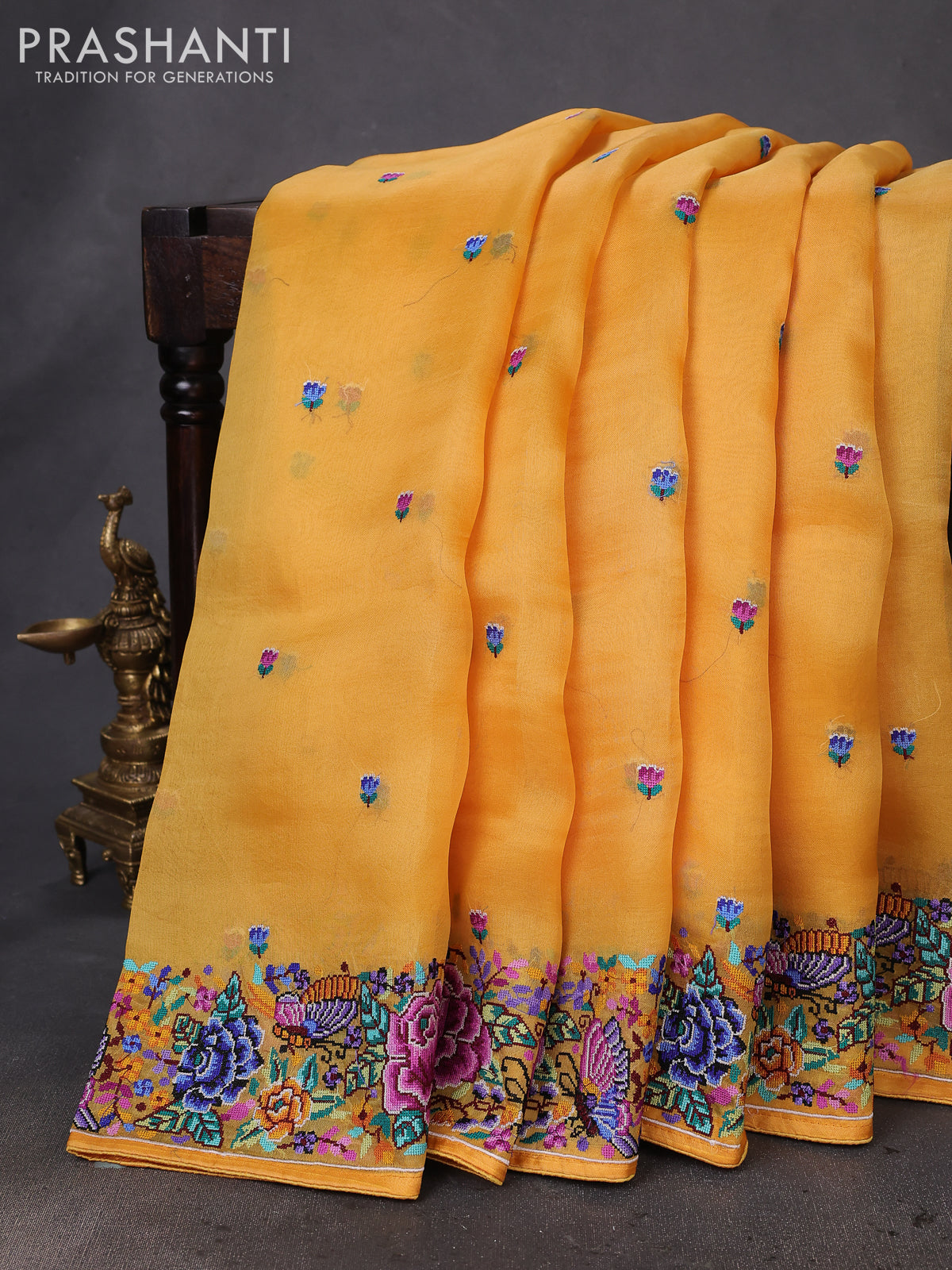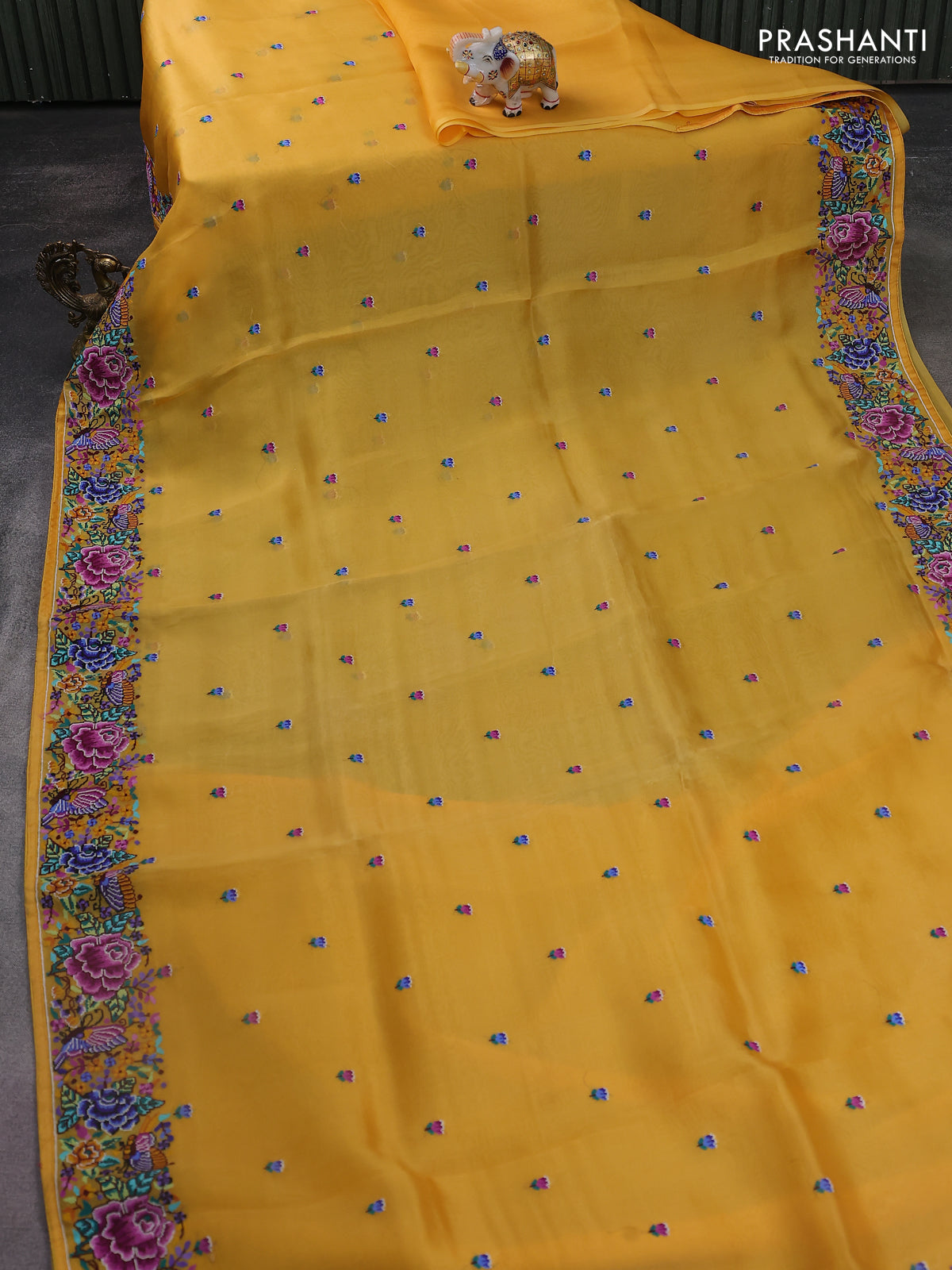 Pure organza silk saree mustard yellow with embroidery buttas and convent embroidery border