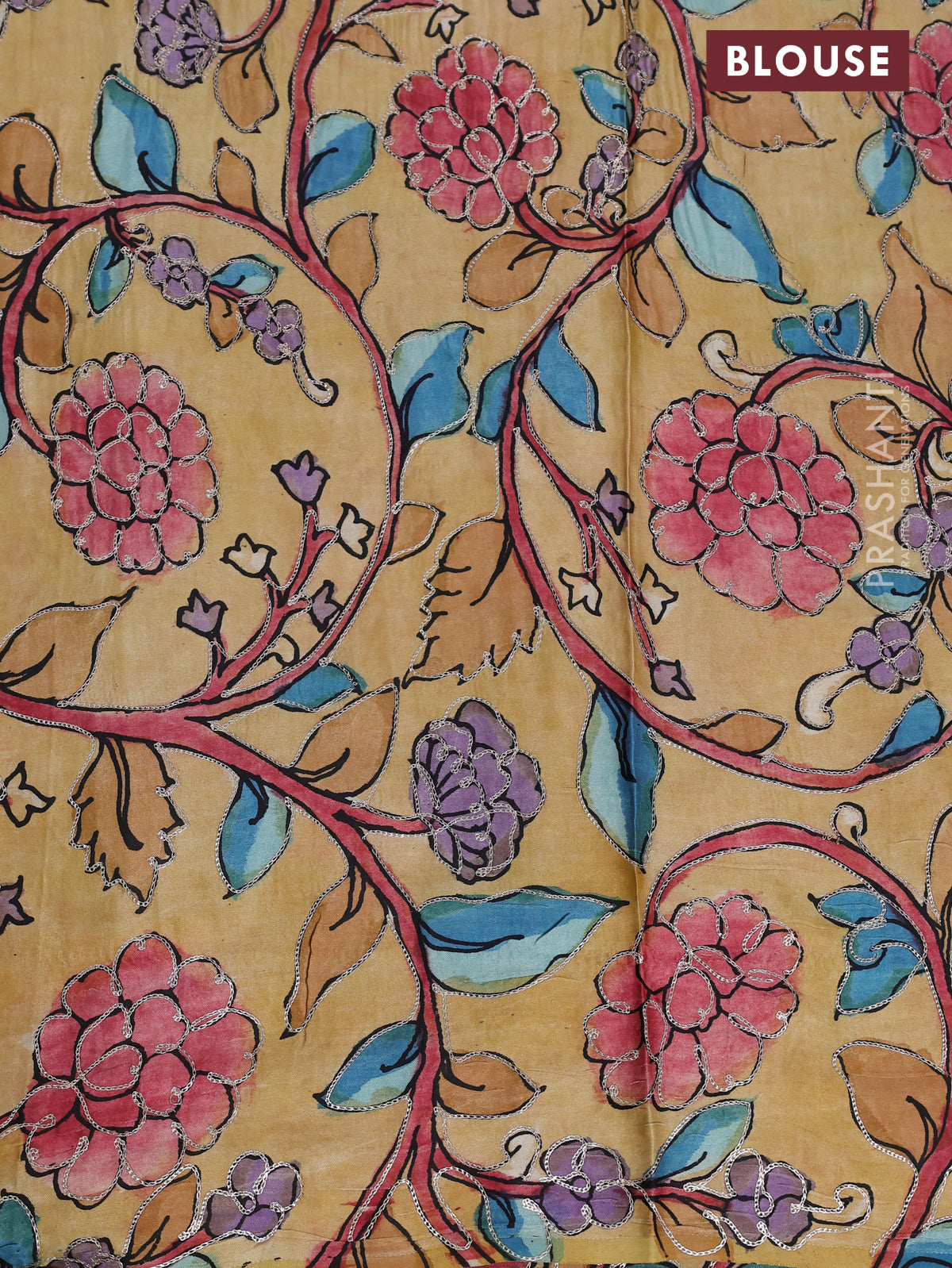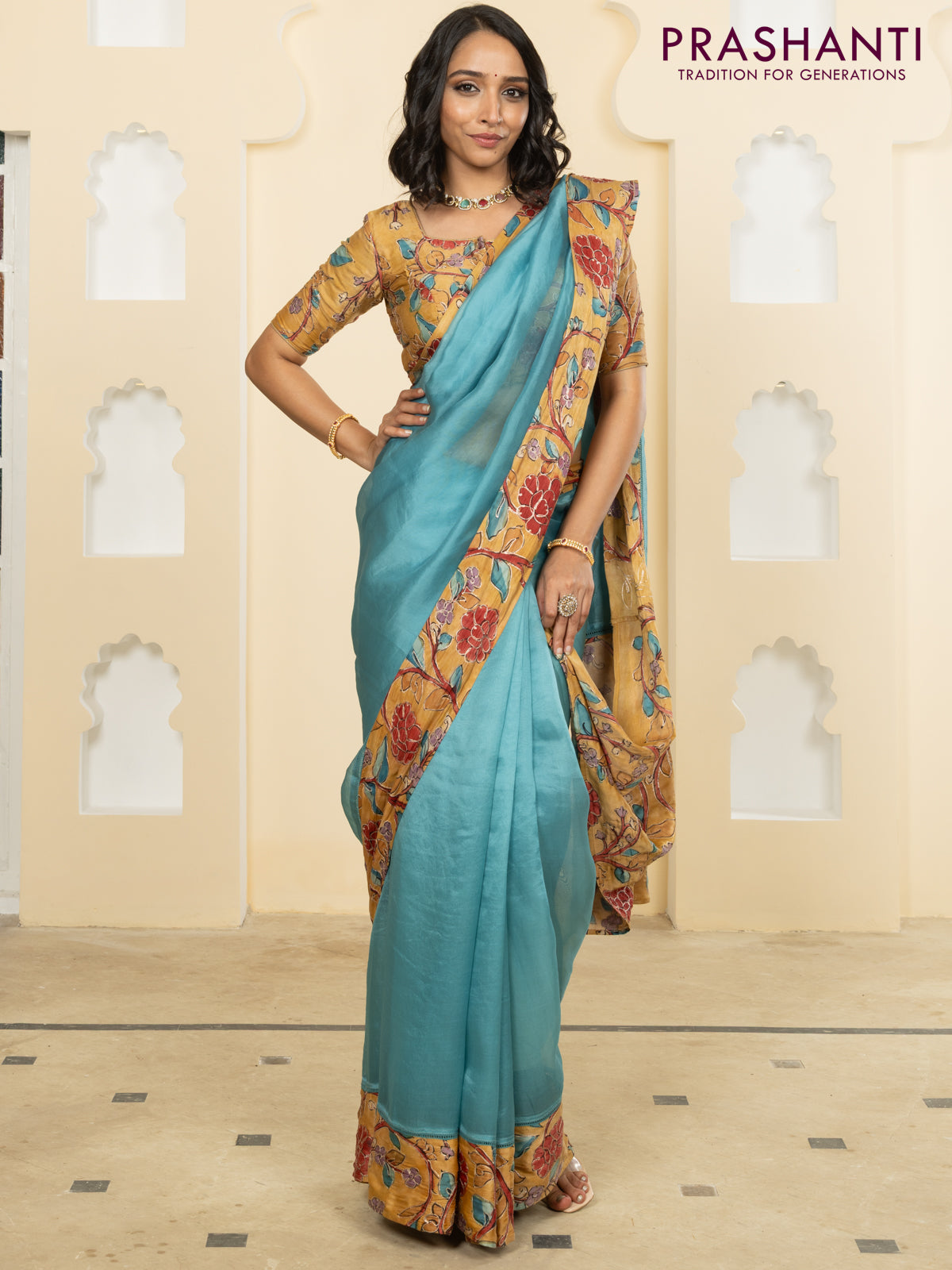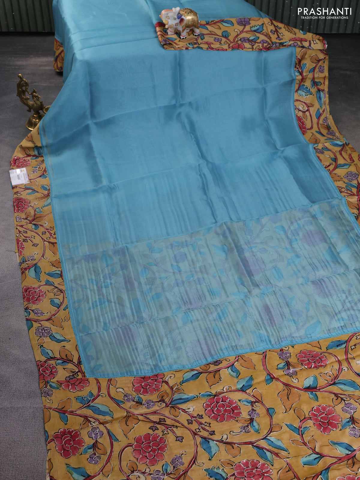 Pure organza silk saree pastel blue and sandal with plain body and kalamkari printed pita work border